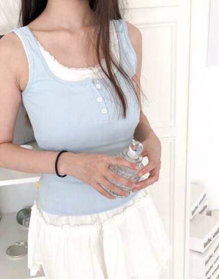 完美情人--清爽感假兩件蕾絲滾邊棉質背心2501201-天空藍