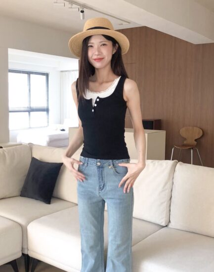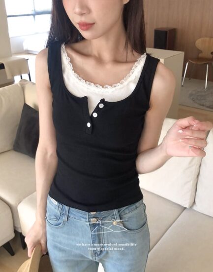 完美情人--清爽感假兩件蕾絲滾邊棉質背心2501201-顯瘦黑
