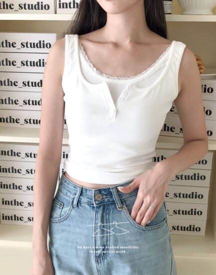 完美情人--清爽感假兩件蕾絲滾邊棉質背心2501201-雲朵白