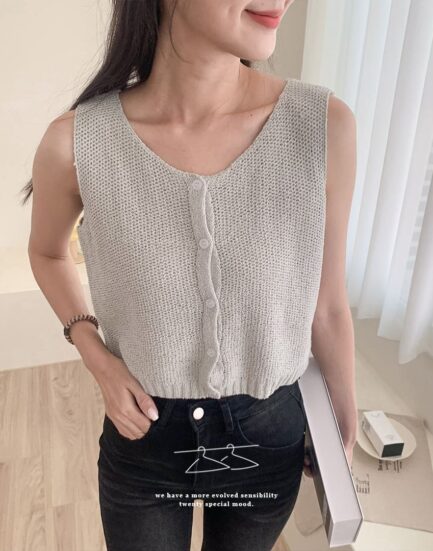 優雅小千金--鏤空小花釦粗針織背心 2501240-淺淺灰