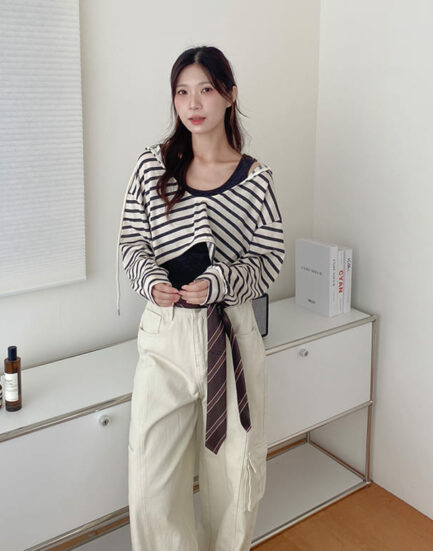 個性韓妞--兩件式疊搭風格針織棉上衣 2501243-條紋白