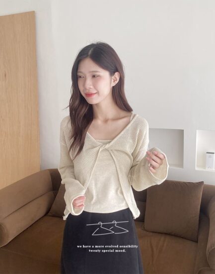 氣質韓妞先修班—兩件式扭結鏤空針織上衣 2502040-鮮奶茶