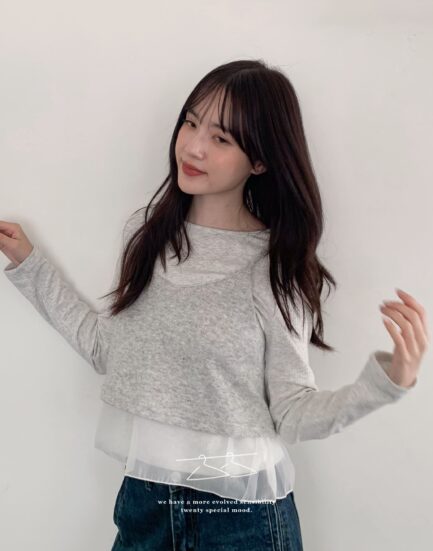 仙女下凡--兩件式雪紡柔膚針織拼接上衣 2501250-淺淺灰