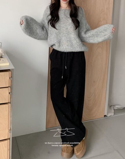 東大門新品—親膚簡約內加絨棉質彎刀長褲 2612003-百搭黑