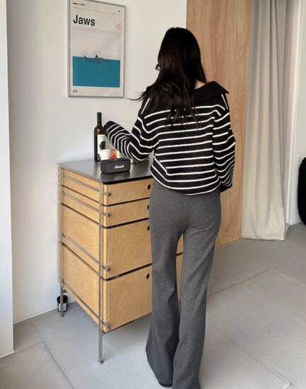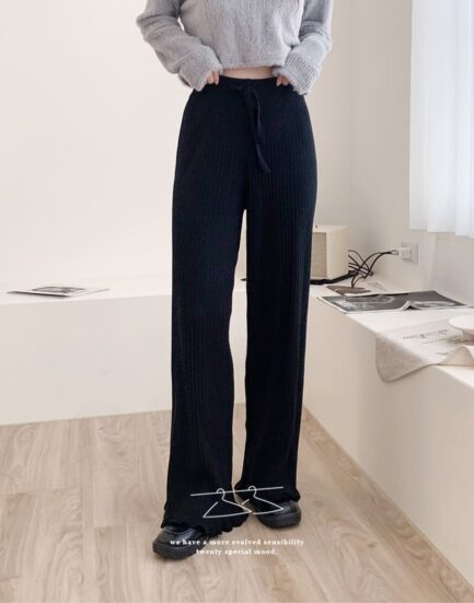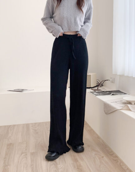 高個友善—超美坑條親膚荷葉邊針織落地長褲 2512036-百搭黑