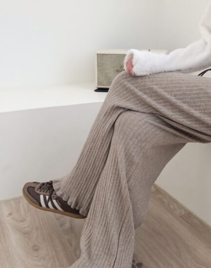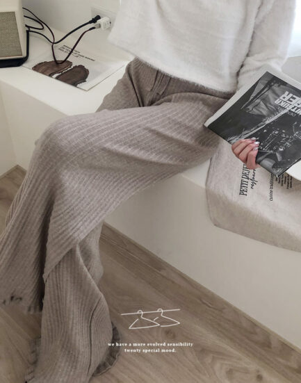 高個友善—超美坑條親膚荷葉邊針織落地長褲 2512036-奶茶