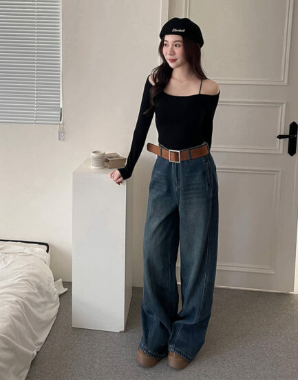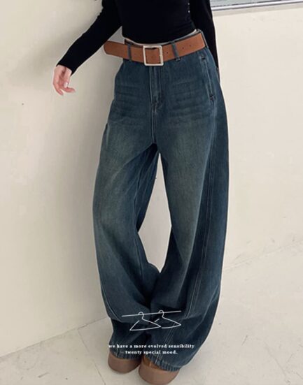 質感比例上身—挺版內刷毛保暖闊腿褲(附腰帶 2612001-丹寧藍