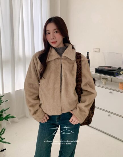貴族千金—高級感保暖柔順熊毛外套 2504033-知性杏