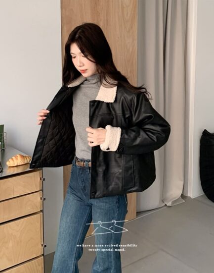 韓系新品-親膚軟皮革QQ熊領騎士外套 2604006-神秘黑