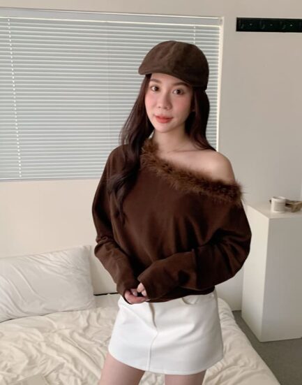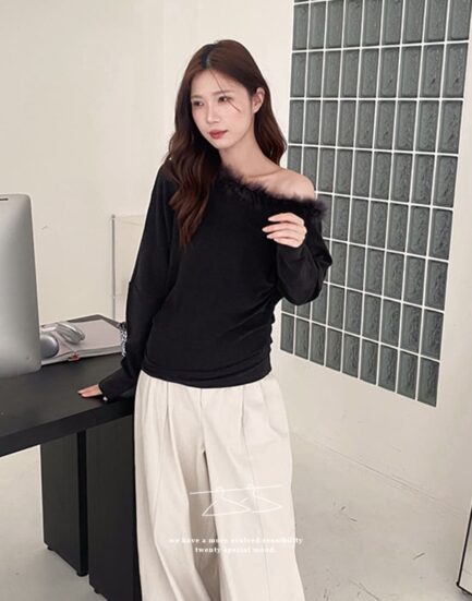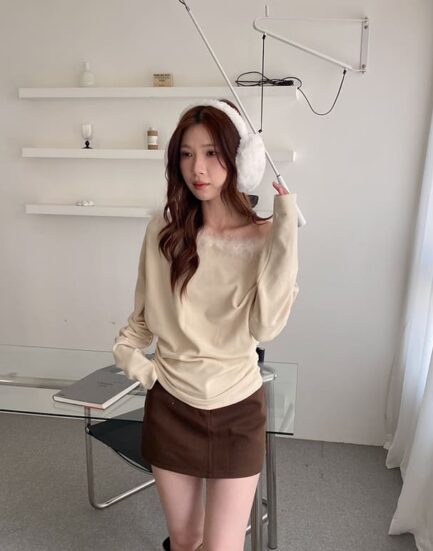 巴黎時裝周—親膚內絨側拉皺柔毛平口上衣 2501272-知性杏
