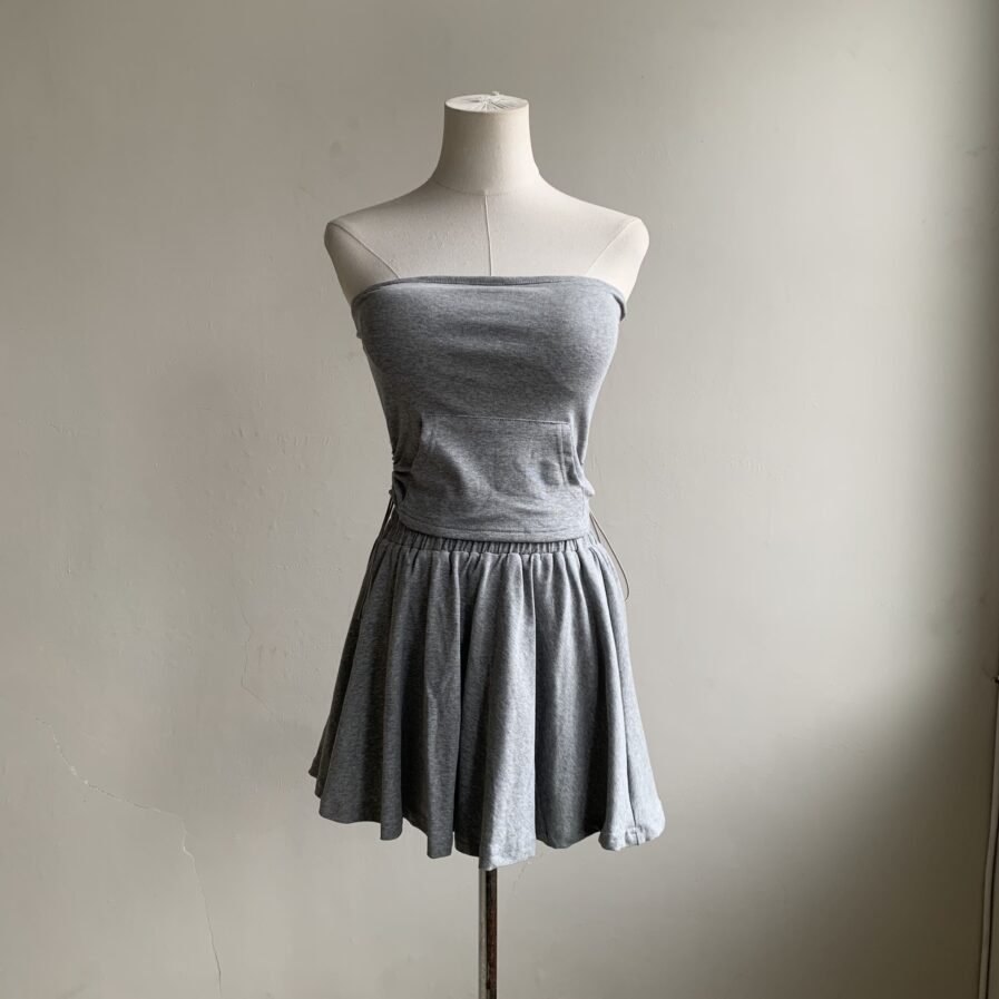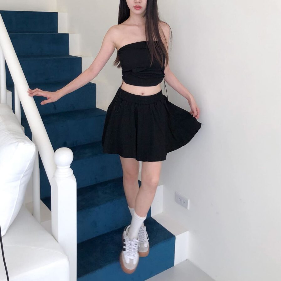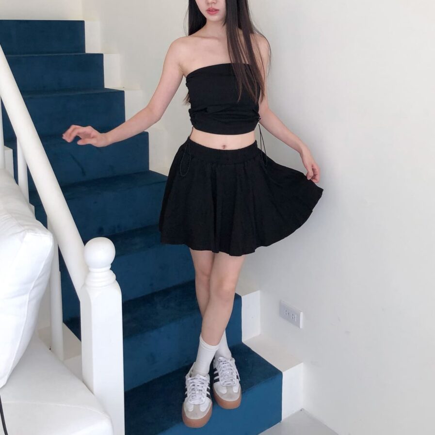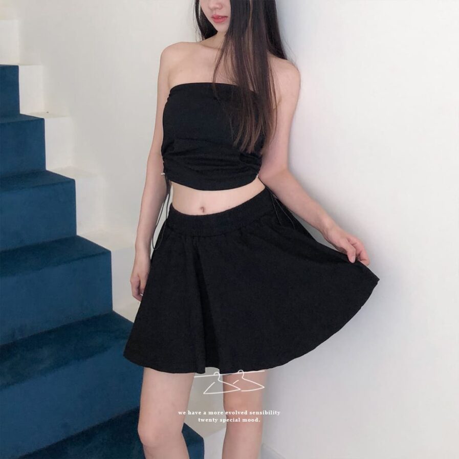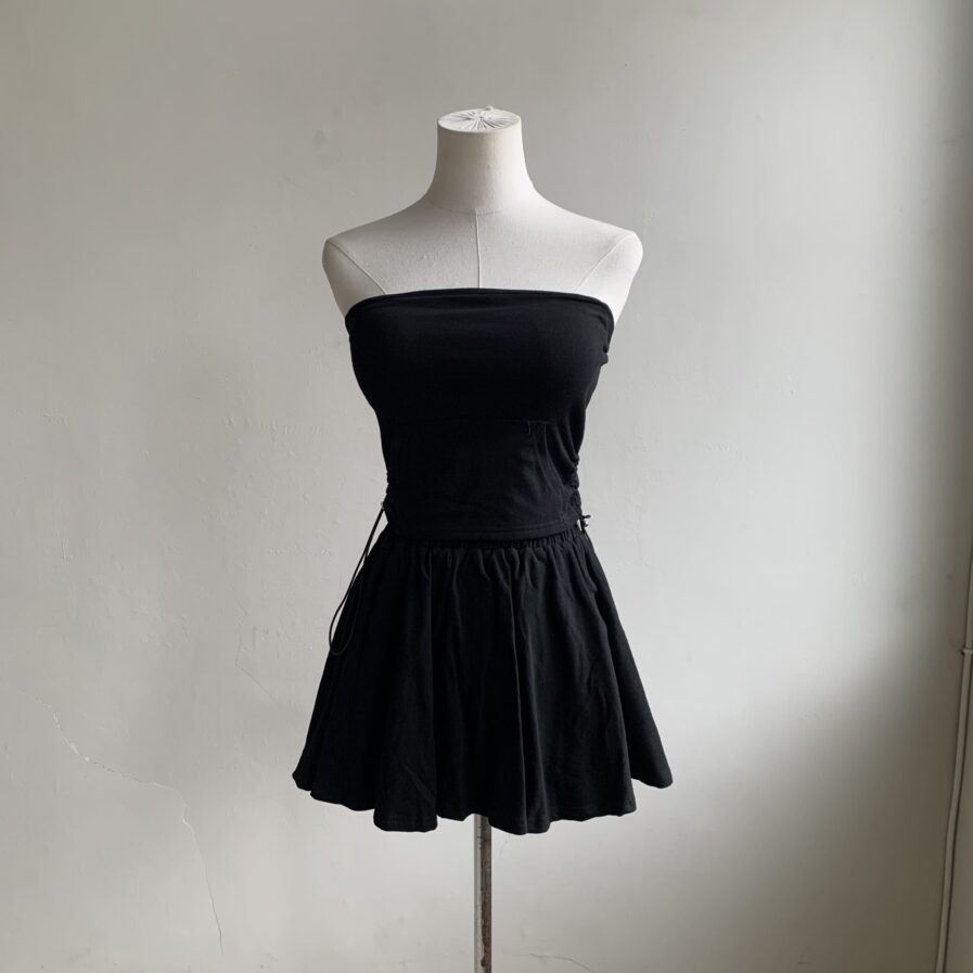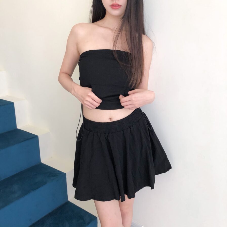 這套平口棉質套裝超可愛! 上衣是平口設計 還貼心做了胸墊 後鬆緊+下抽繩穿起來很穩~ 還有小口袋超加分✨ 下半身是傘狀裙子 俏皮可愛又有內裡褲子 完全不用怕走光 穿起來舒服又安心💕