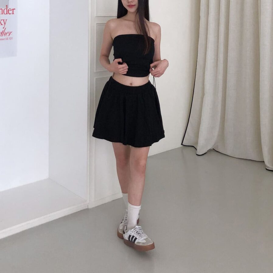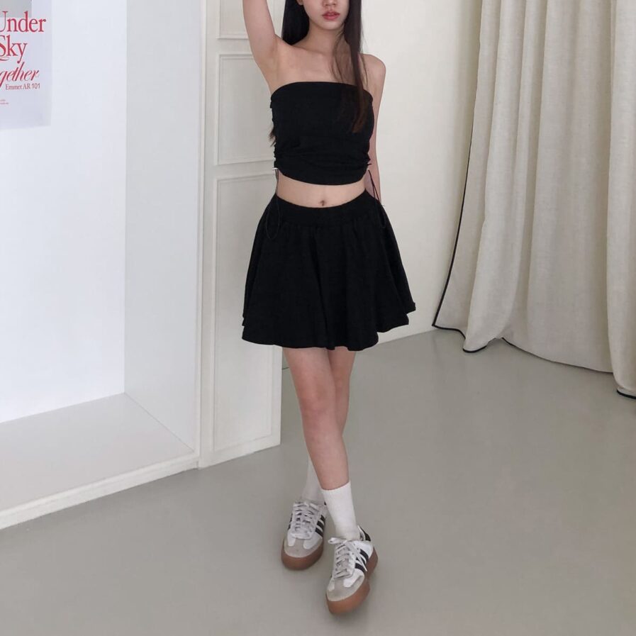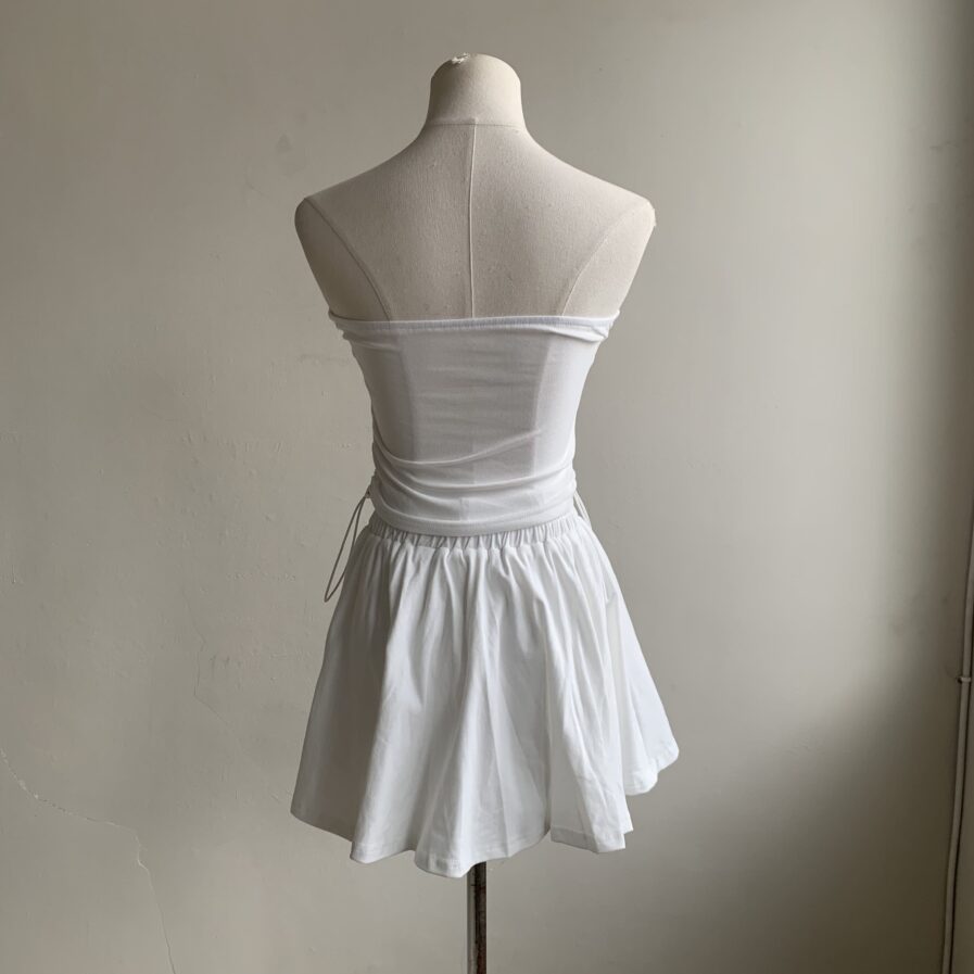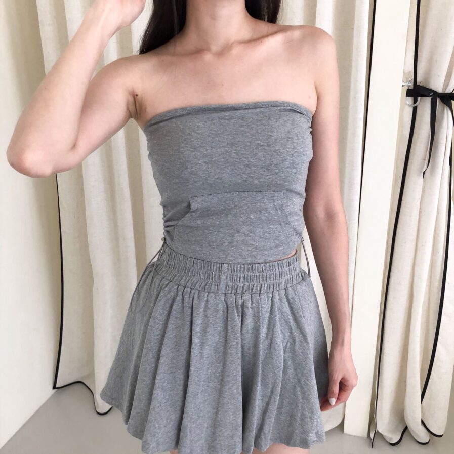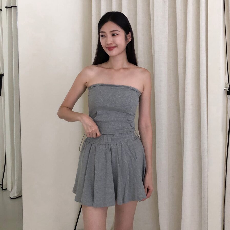 這套平口棉質套裝超可愛! 上衣是平口設計 還貼心做了胸墊 後鬆緊+下抽繩穿起來很穩~ 還有小口袋超加分✨ 下半身是傘狀裙子 俏皮可愛又有內裡褲子 完全不用怕走光 穿起來舒服又安心💕
