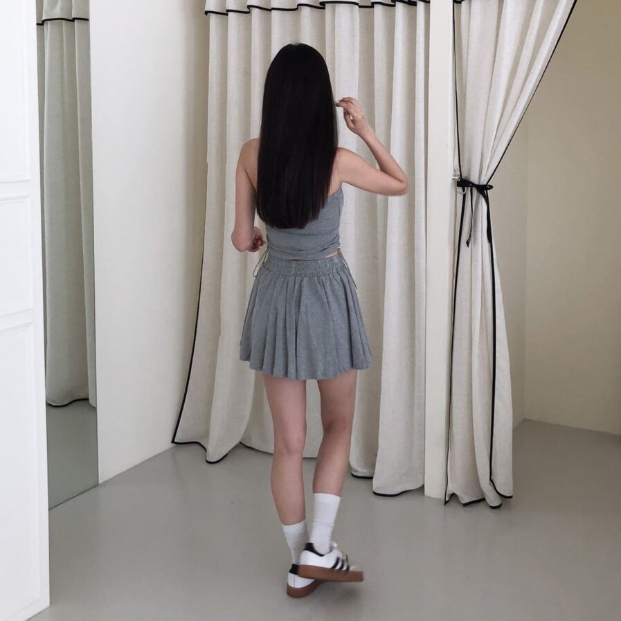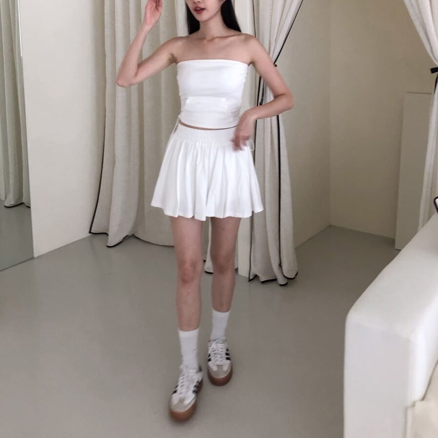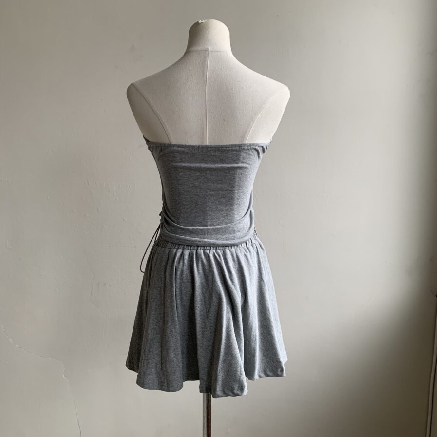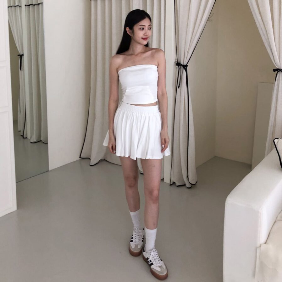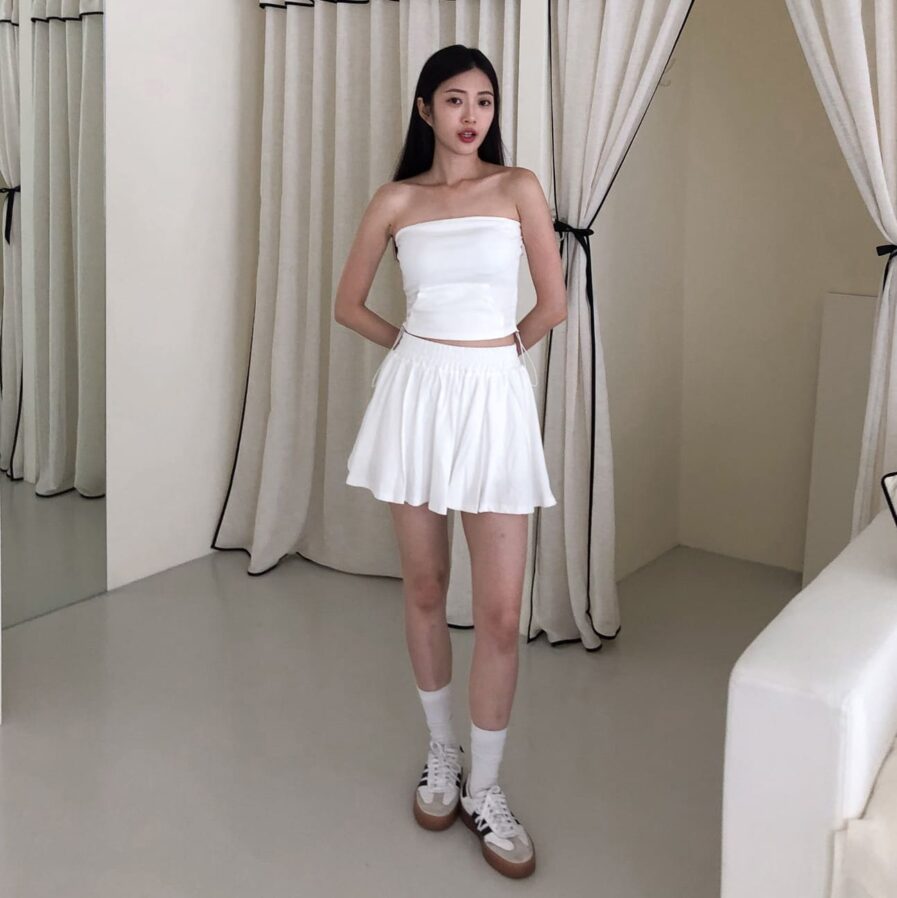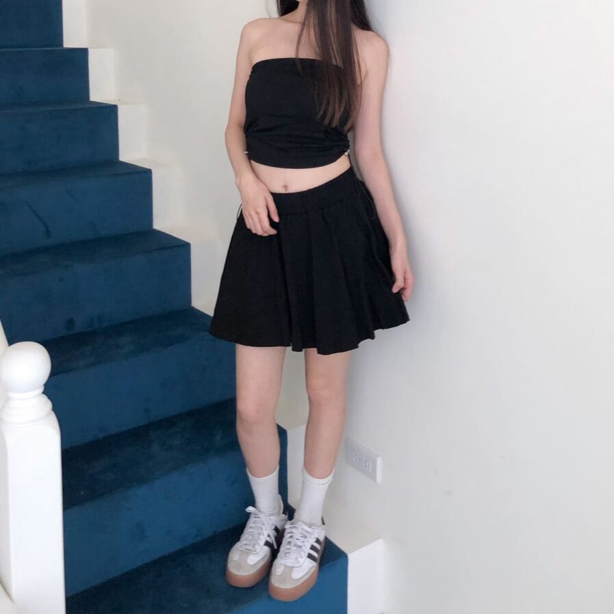 這套平口棉質套裝超可愛! 上衣是平口設計 還貼心做了胸墊 後鬆緊+下抽繩穿起來很穩~ 還有小口袋超加分✨ 下半身是傘狀裙子 俏皮可愛又有內裡褲子 完全不用怕走光 穿起來舒服又安心💕