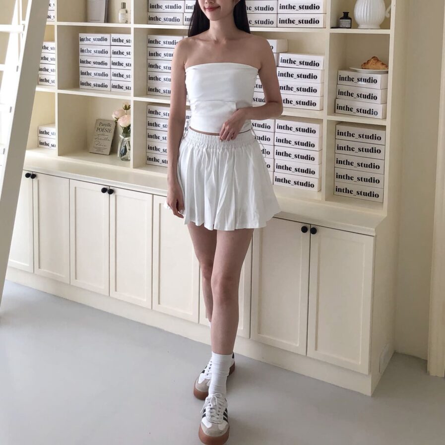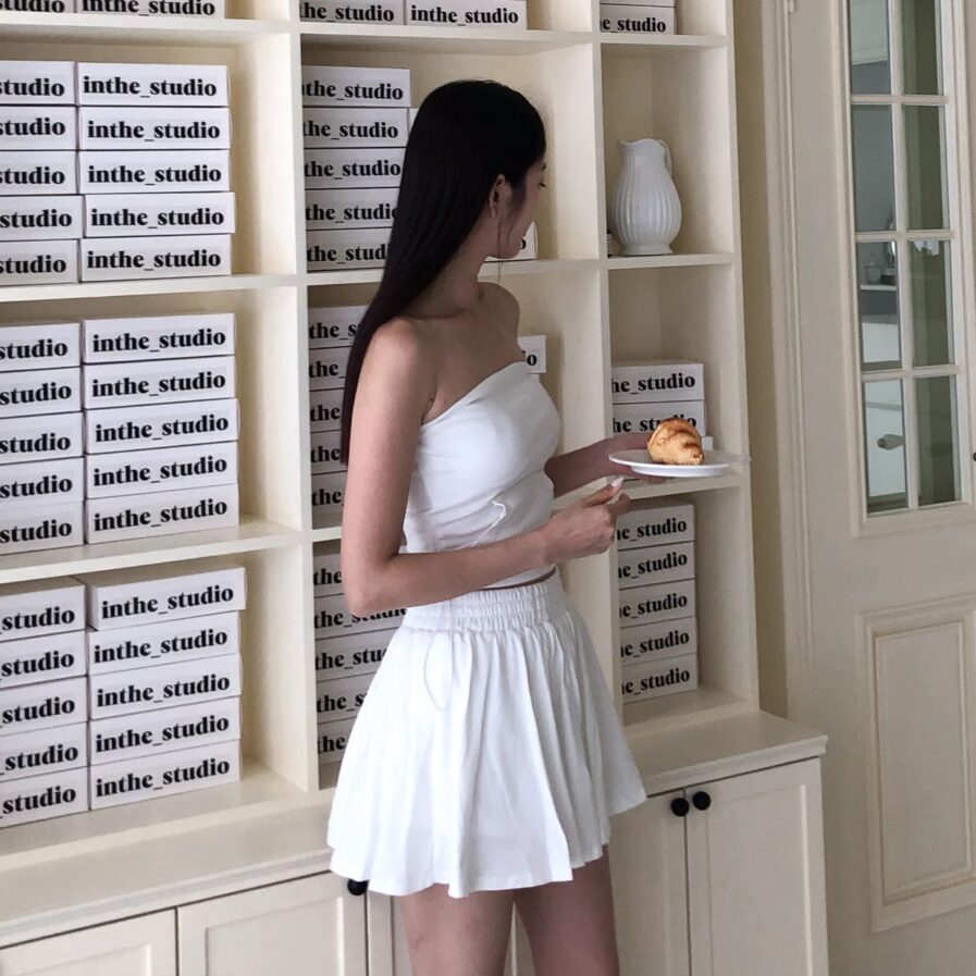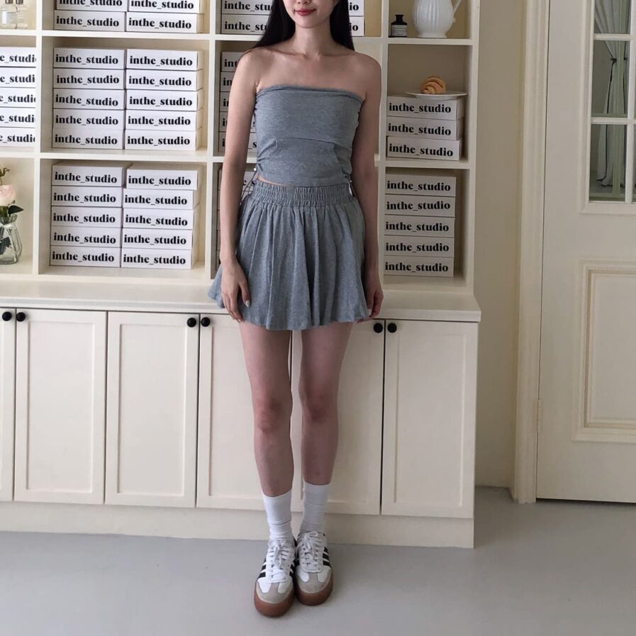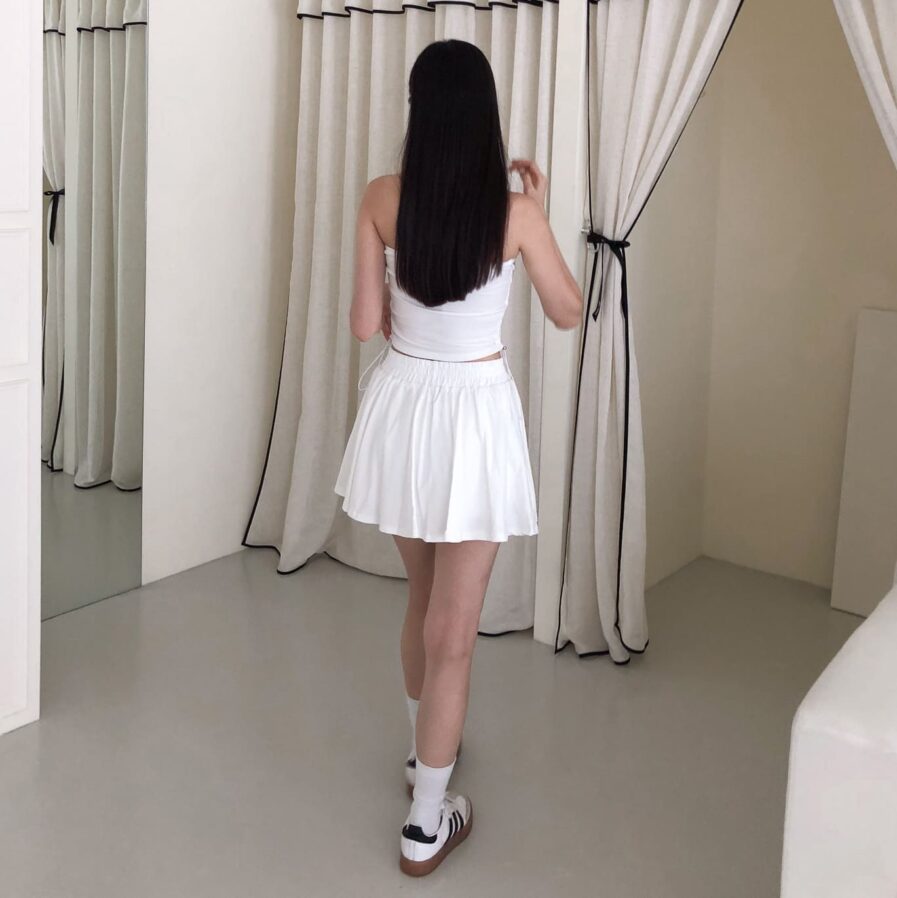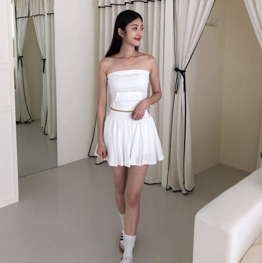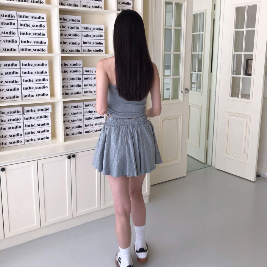 這套平口棉質套裝超可愛! 上衣是平口設計 還貼心做了胸墊 後鬆緊+下抽繩穿起來很穩~ 還有小口袋超加分✨ 下半身是傘狀裙子 俏皮可愛又有內裡褲子 完全不用怕走光 穿起來舒服又安心💕