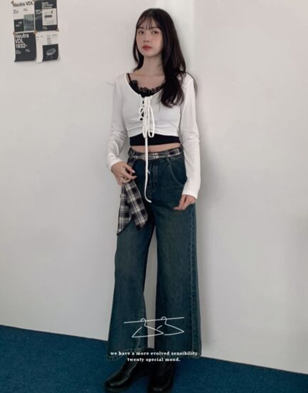 韓系girl--舒適版型刷舊高磅牛仔寬褲(附腰帶 2512034-復古藍