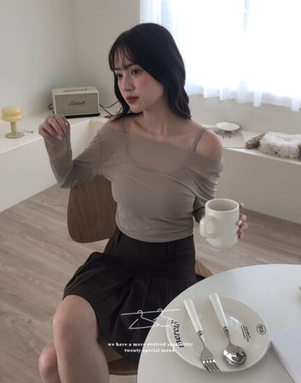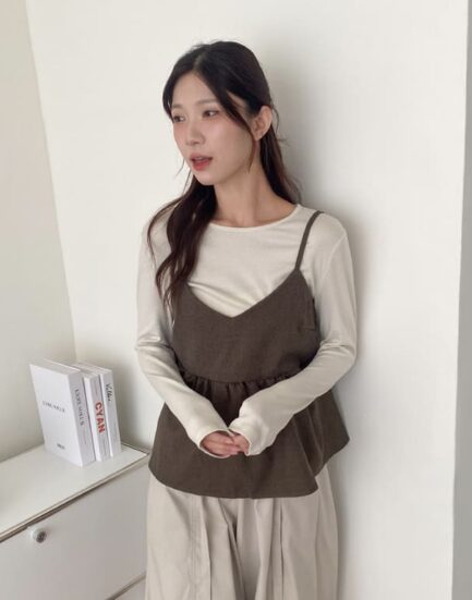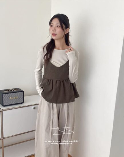 貴族千金感--霧感絨面磨毛親膚兩件式上衣 2501244-咖啡牛奶