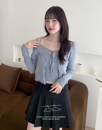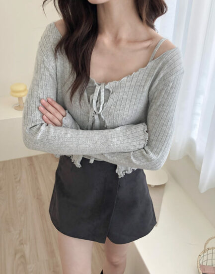 氣質韓妞先修班—兩件式扭結鏤空針織上衣 2502040-淺淺灰