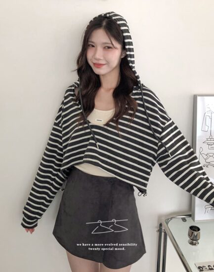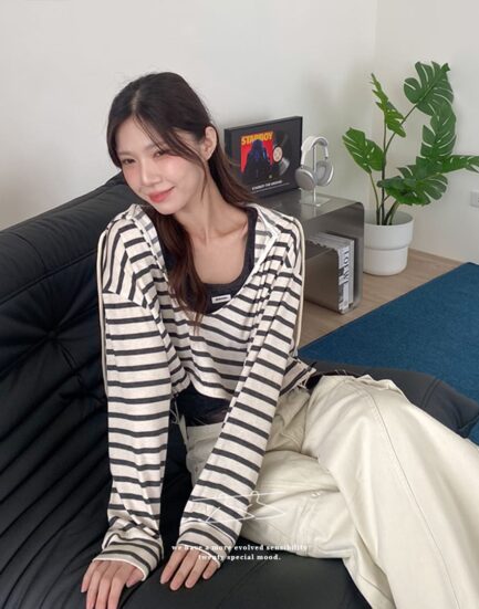 個性韓妞--兩件式疊搭風格針織棉上衣 2501243-條紋黑