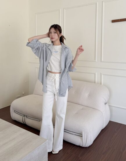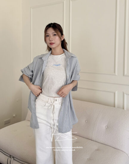 韓妞新歡--遮陽百搭條紋寬版棉麻襯衫 2505010-天空藍