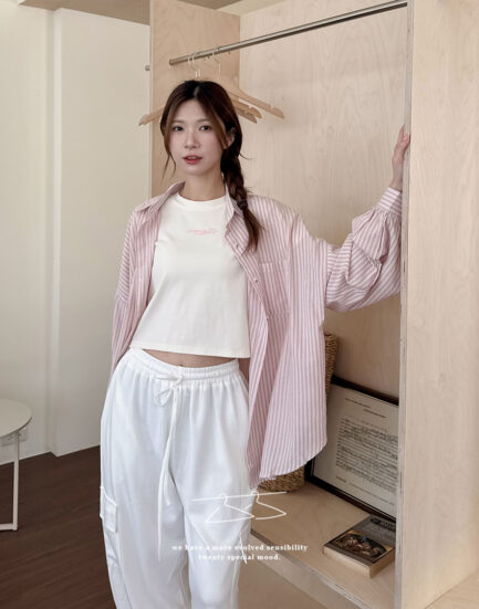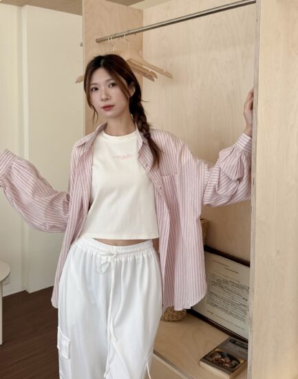 韓妞新歡--遮陽百搭條紋寬版棉麻襯衫 2505010-迷人粉