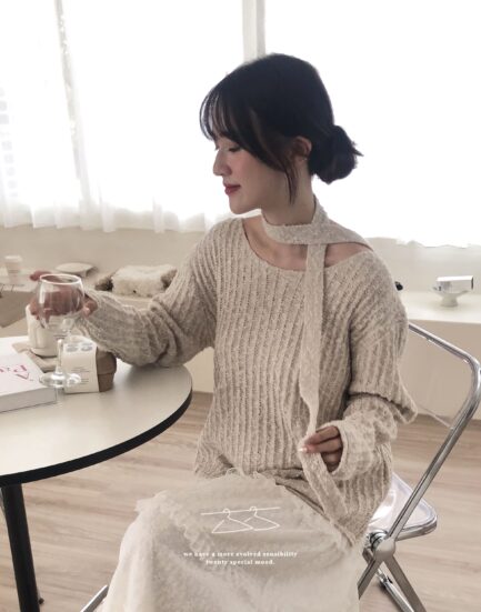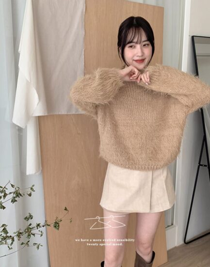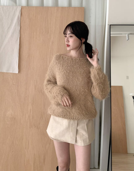 小仙女降臨--霧面柔感寬領水貂毛針織上衣 2502026-咖啡牛奶
