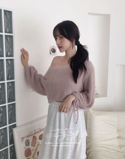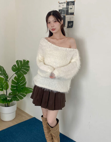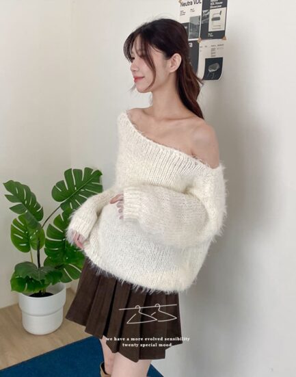 小仙女降臨--霧面柔感寬領水貂毛針織上衣 2502026-氣質白