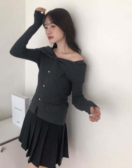 氣質優雅款--金釦一字肩親膚針織上衣 2502027-優雅灰