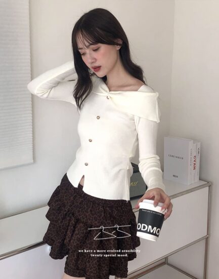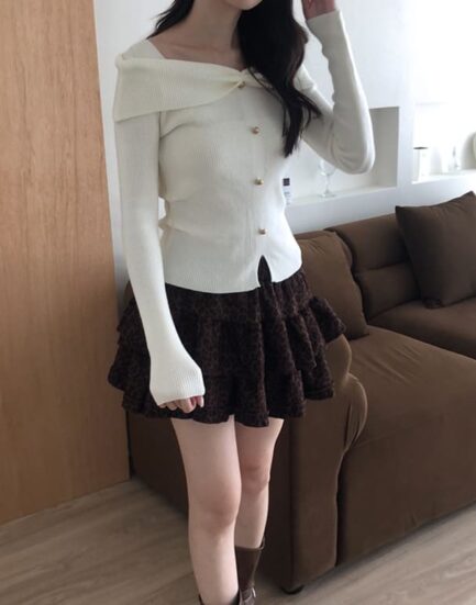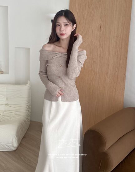 氣質優雅款--金釦一字肩親膚針織上衣 2502027-鮮奶茶