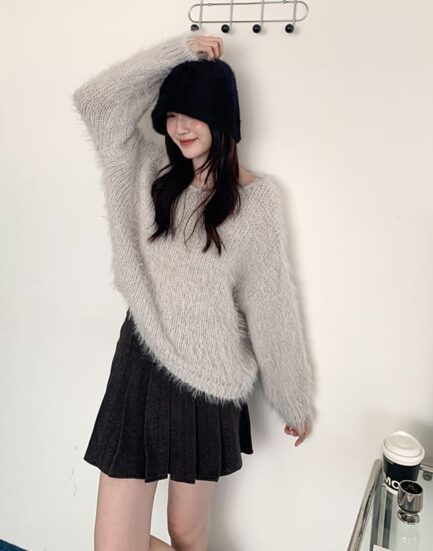 小仙女降臨--霧面柔感寬領水貂毛針織上衣 2502026-淺淺灰