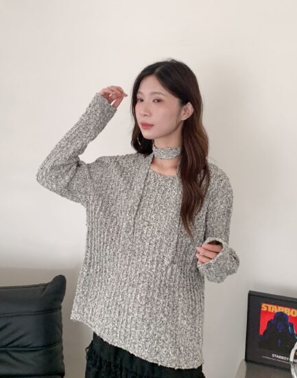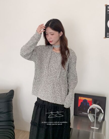 自帶優雅光--簡約混織綁帶厚版針織上衣 2502031-淺淺灰