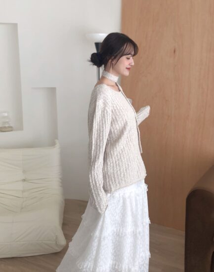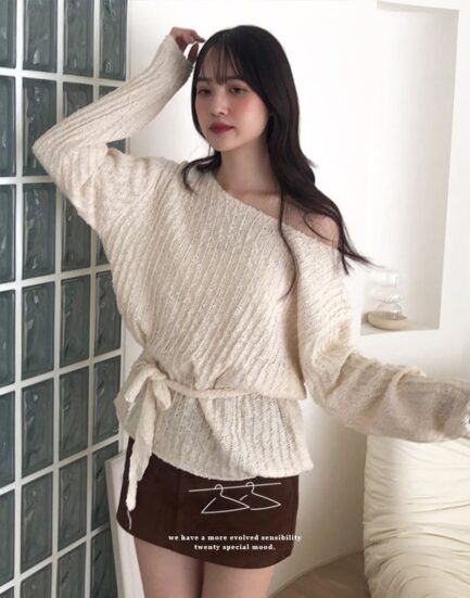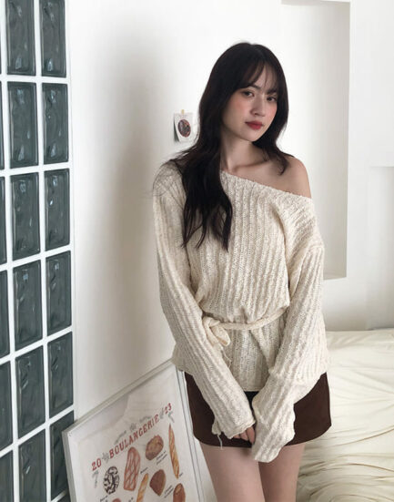 自帶優雅光--簡約混織綁帶厚版針織上衣 2502031-奶油杏