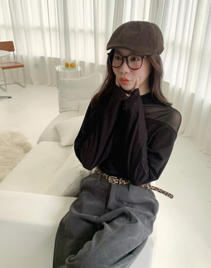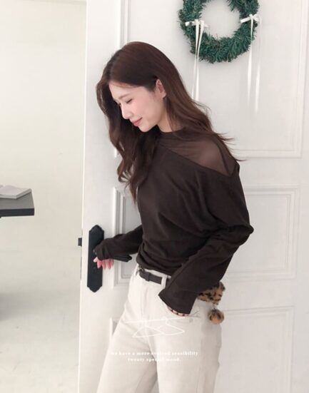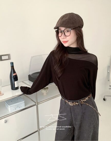 美感純欲小心機—透紗立領拼接平口棉質上衣 2501269-美式咖啡