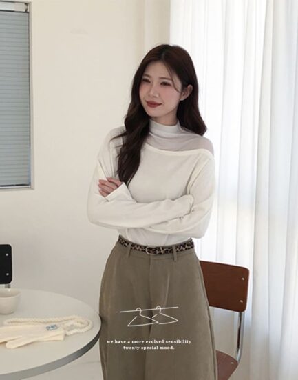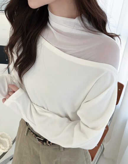 美感純欲小心機—透紗立領拼接平口棉質上衣 2501269-氣質白