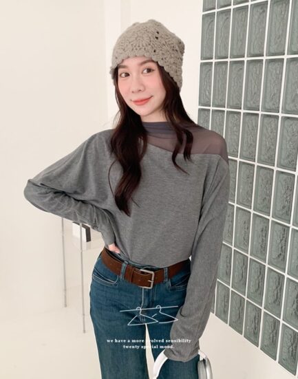 美感純欲小心機—透紗立領拼接平口棉質上衣 2501269-優雅灰