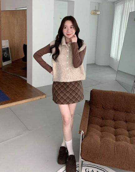 晚宴焦點--高榜格紋毛呢A字口袋款裙(附腰帶 2613002-咖啡牛奶