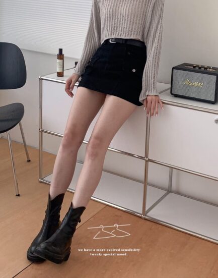 穿搭班底--簡約質感麂皮絨A字短裙(附腰帶 2513023-神秘黑