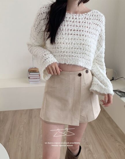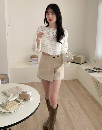 俏麗韓妞--簡約高級感雙釦麂皮短褲裙 2513022-知性杏