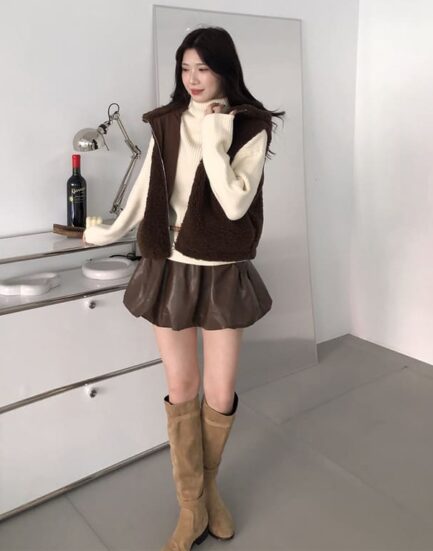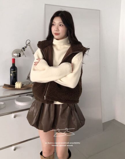 甜酷女孩--皮革軟料口袋花苞短裙2513019-咖啡牛奶
