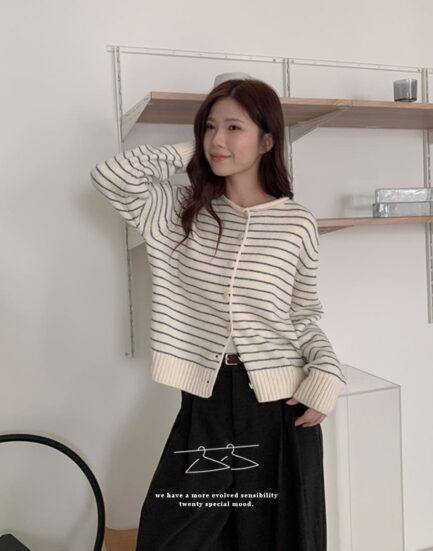 質感鄰家女孩--溫暖感親膚條紋捲邊針織上衣 2501267-米白
