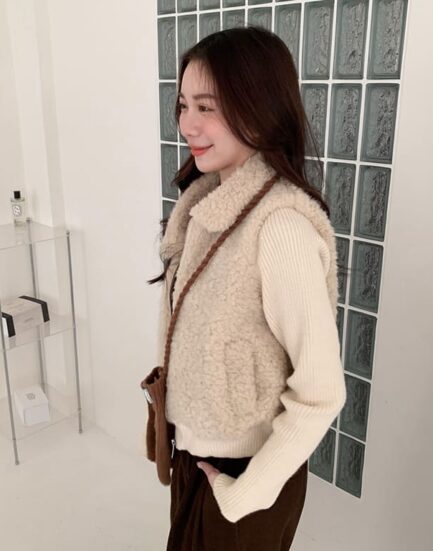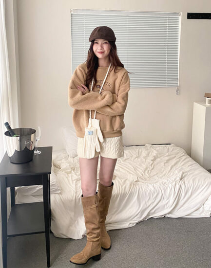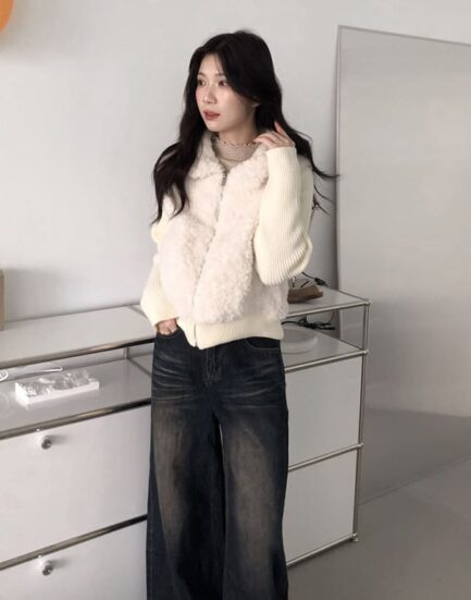 時尚博主是你—拼接針織親膚泰迪熊毛外套 2504032-鮮奶茶