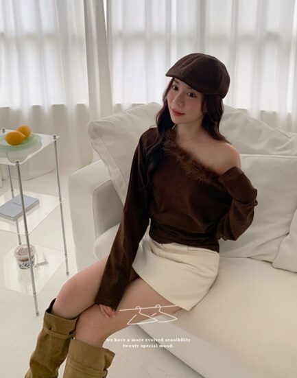 巴黎時裝周—親膚內絨側拉皺柔毛平口上衣 2501272-知性杏