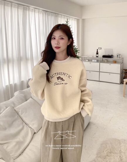 東大門新品上線—貴族QQ毛字母圓領上衣 2501273-知性杏