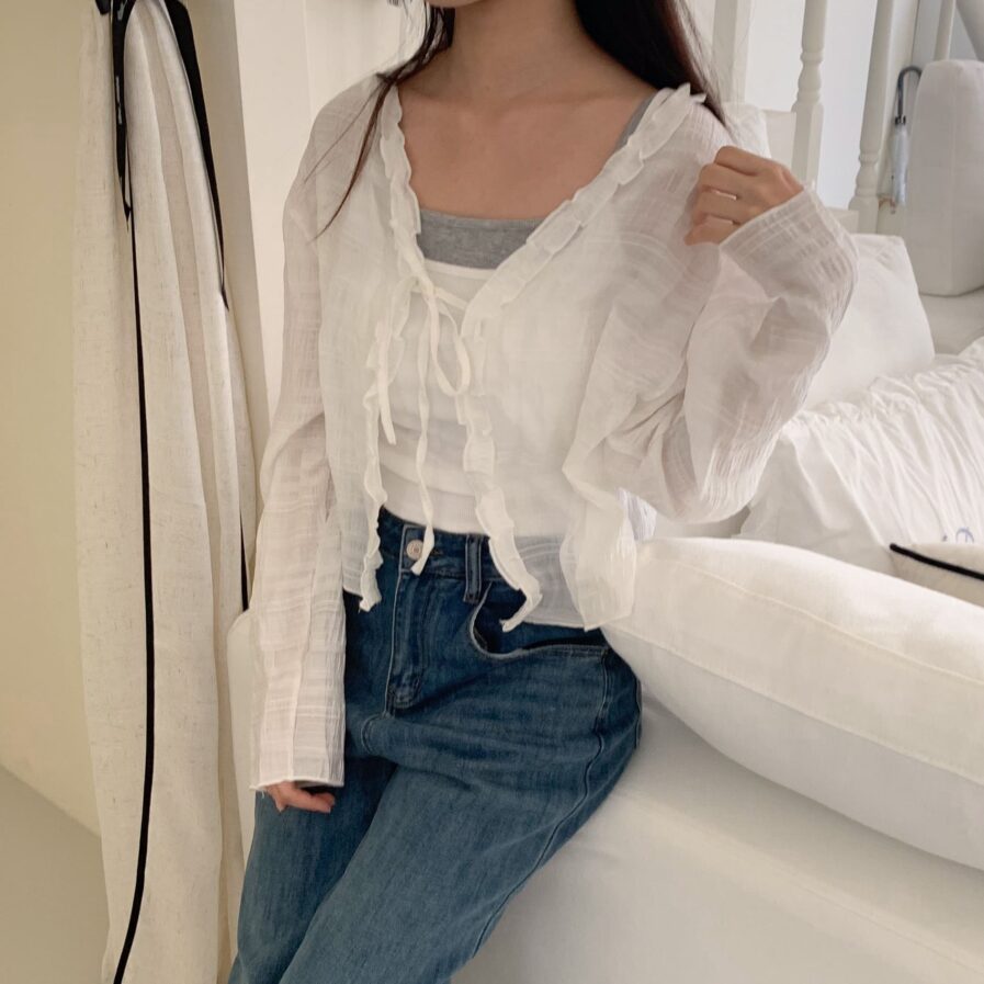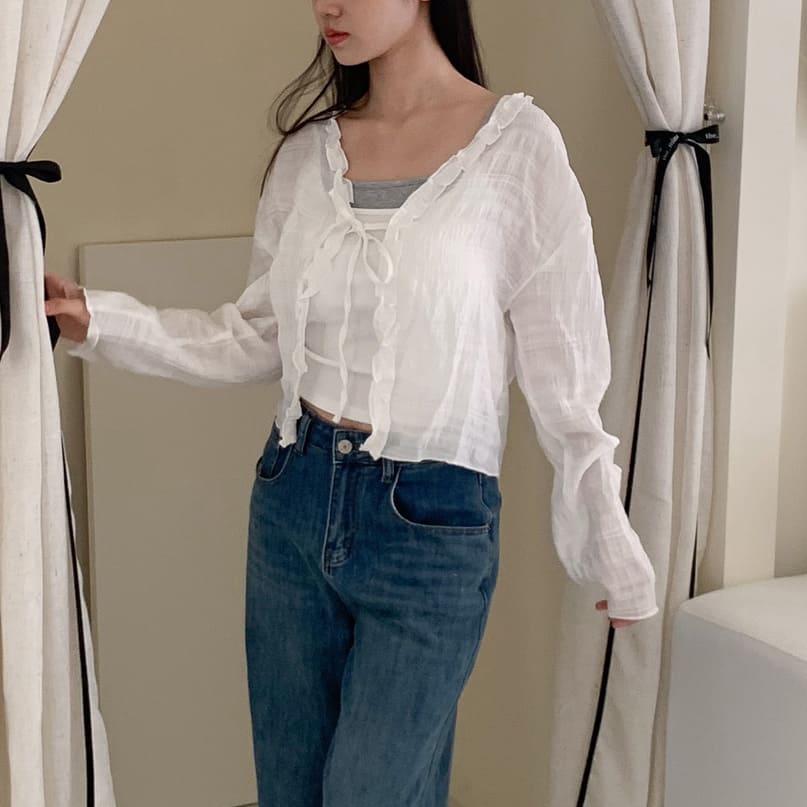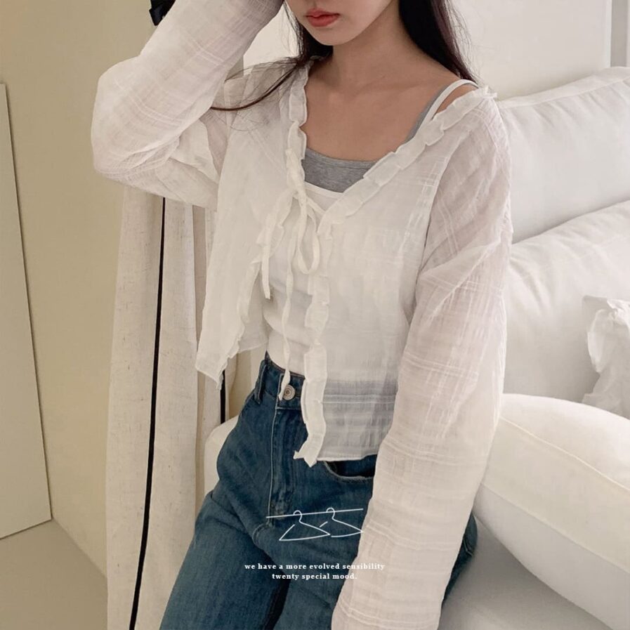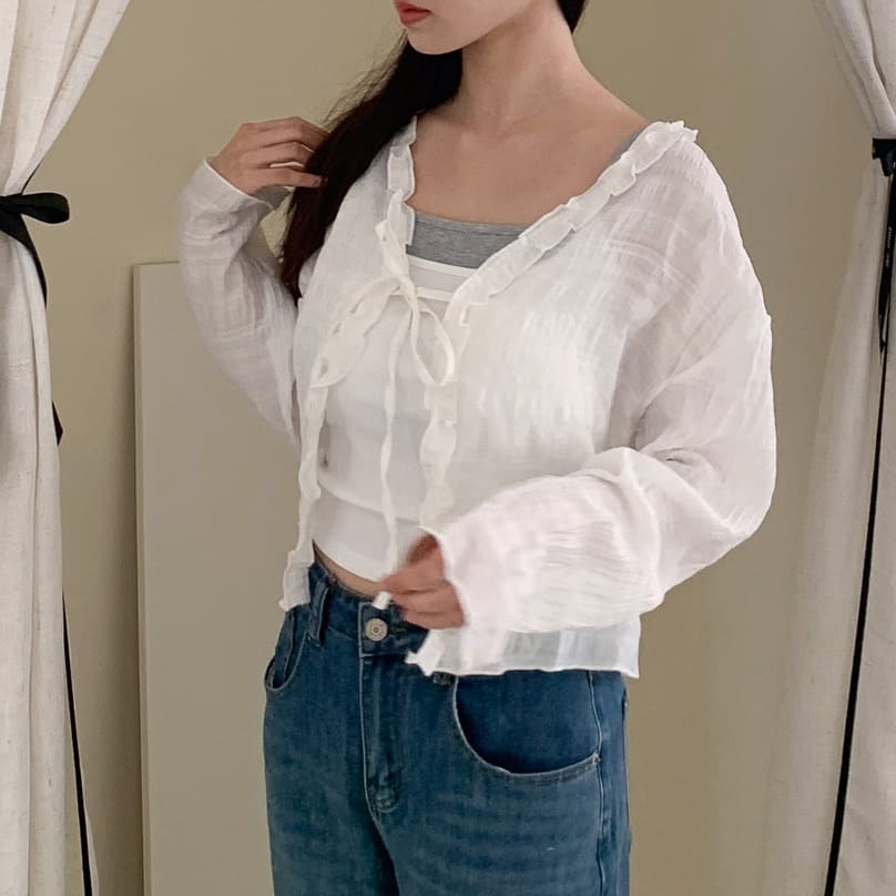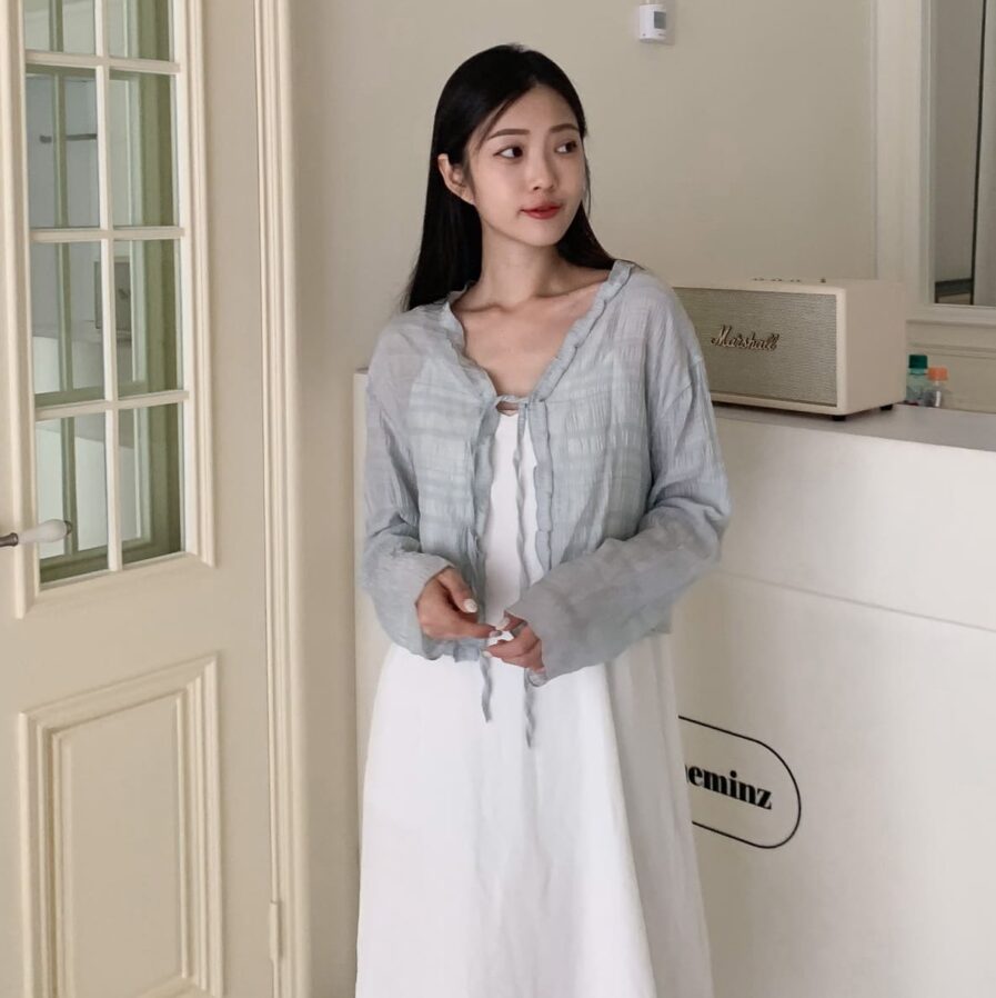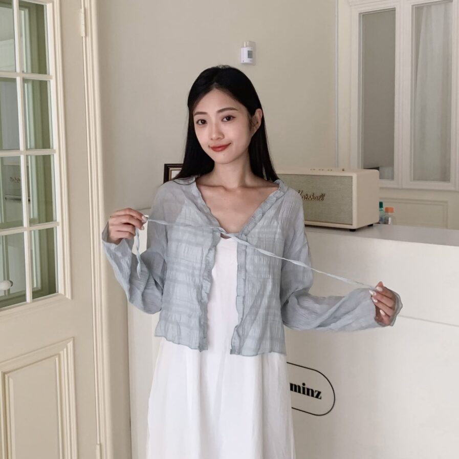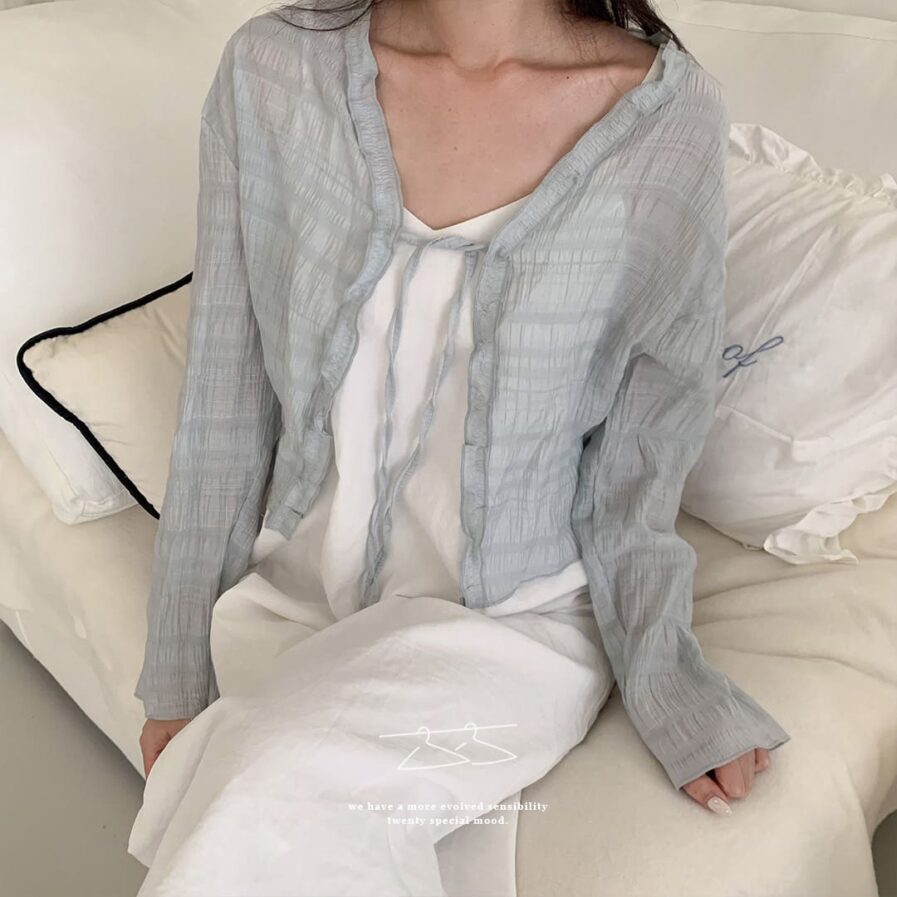 胸前綁帶設計 甜美中帶點小俏皮💕輕盈面料帶著水波紋的律動感 走起路來自帶飄飄濾鏡✨微微透膚 若隱若現的仙女感 配洋裝或小可愛都好看~日常防曬都能美到犯規☀️