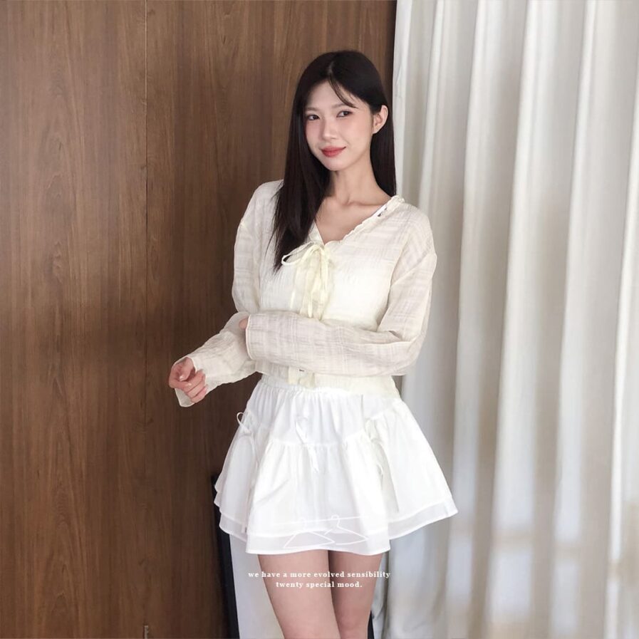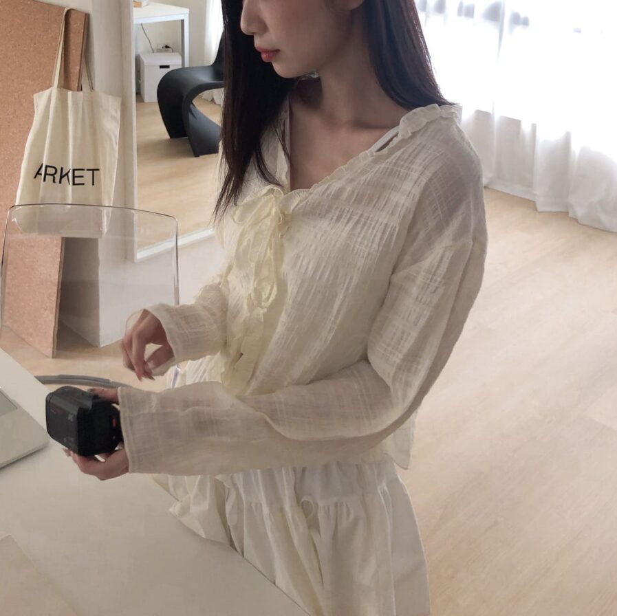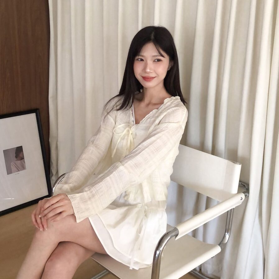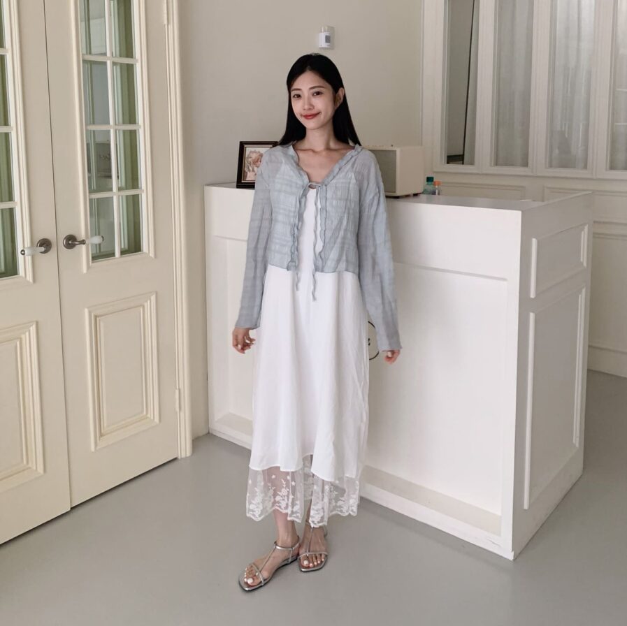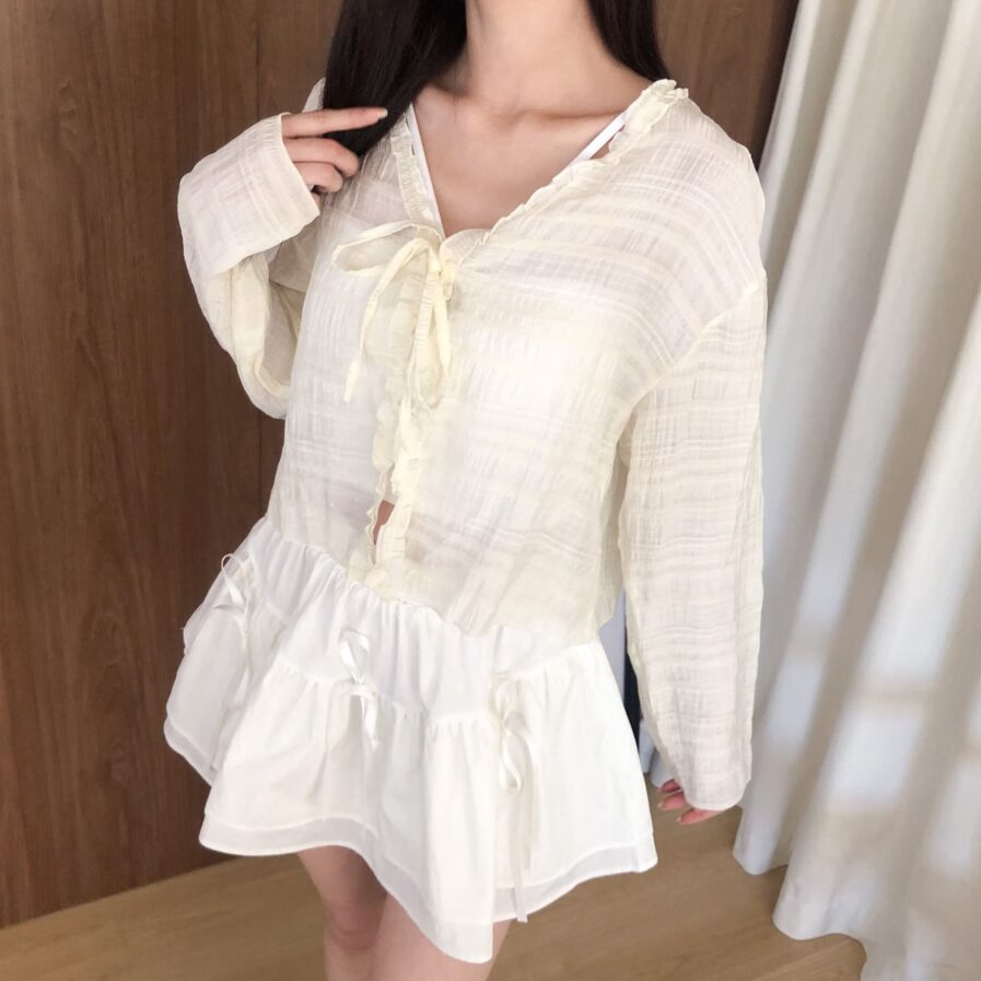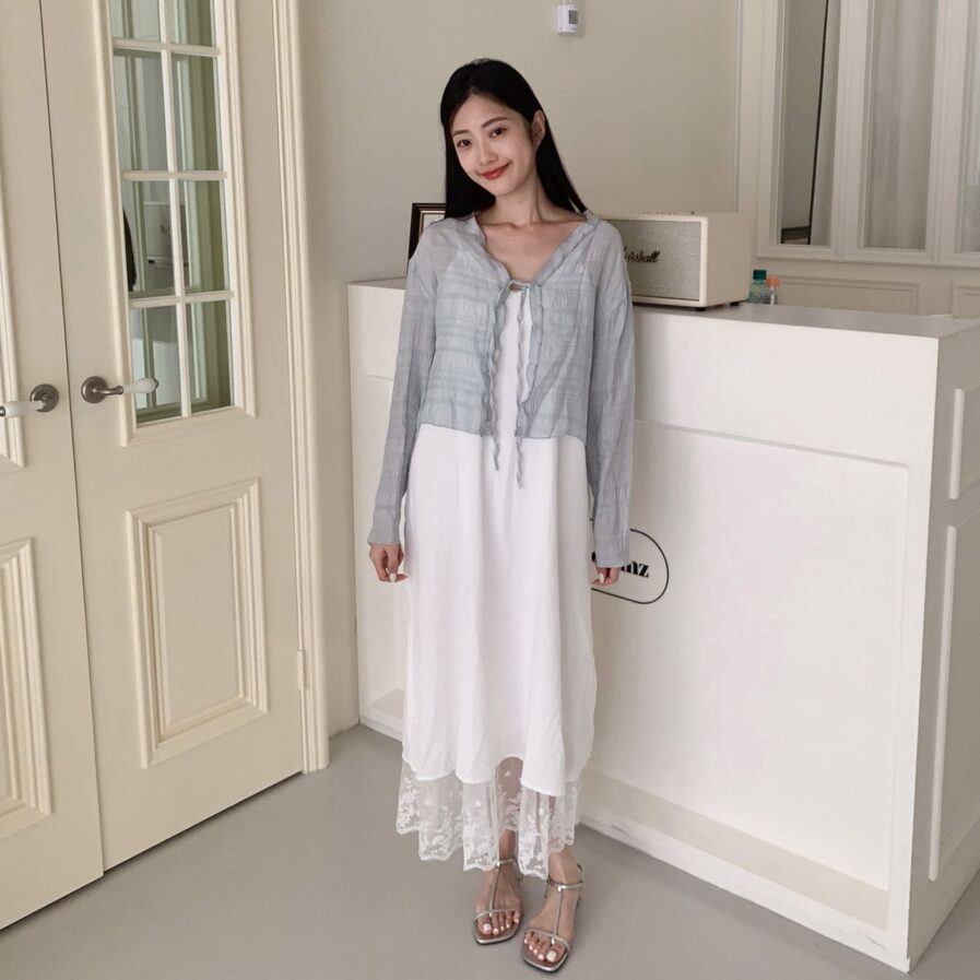 胸前綁帶設計 甜美中帶點小俏皮💕輕盈面料帶著水波紋的律動感 走起路來自帶飄飄濾鏡✨微微透膚 若隱若現的仙女感 配洋裝或小可愛都好看~日常防曬都能美到犯規☀️