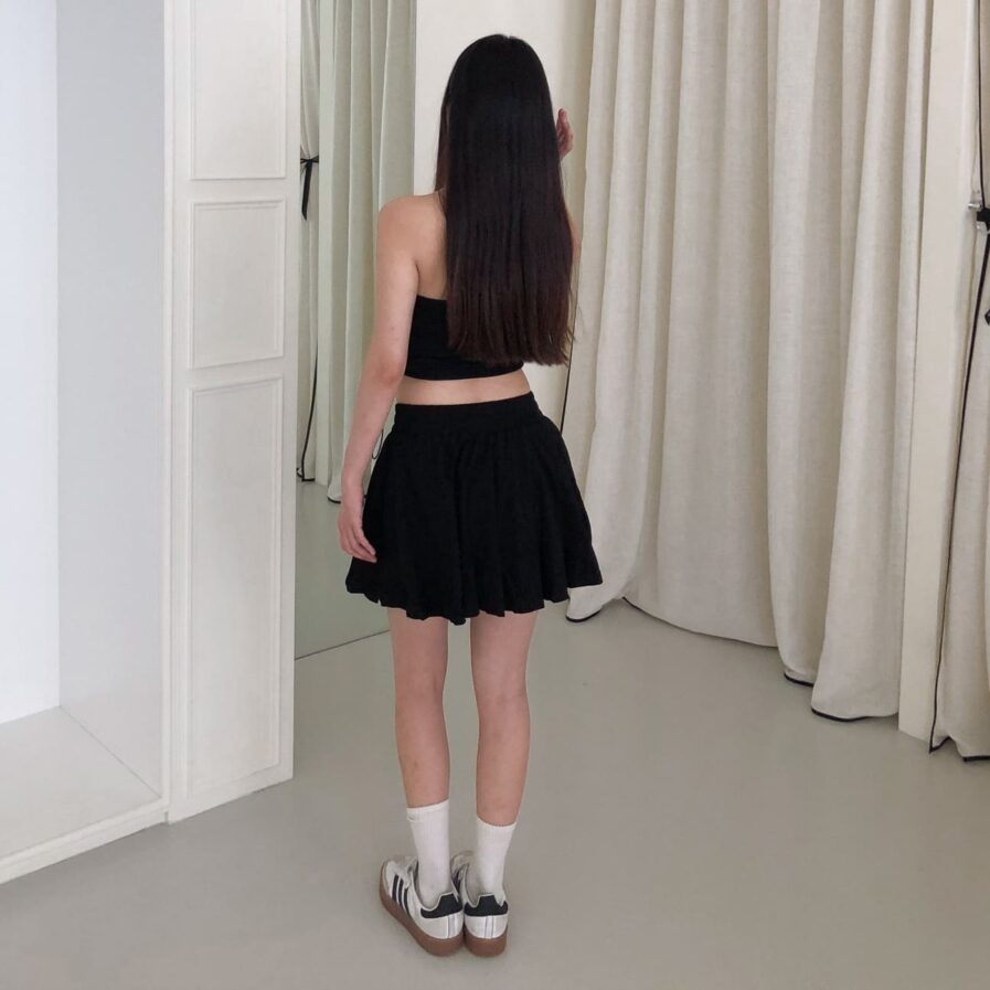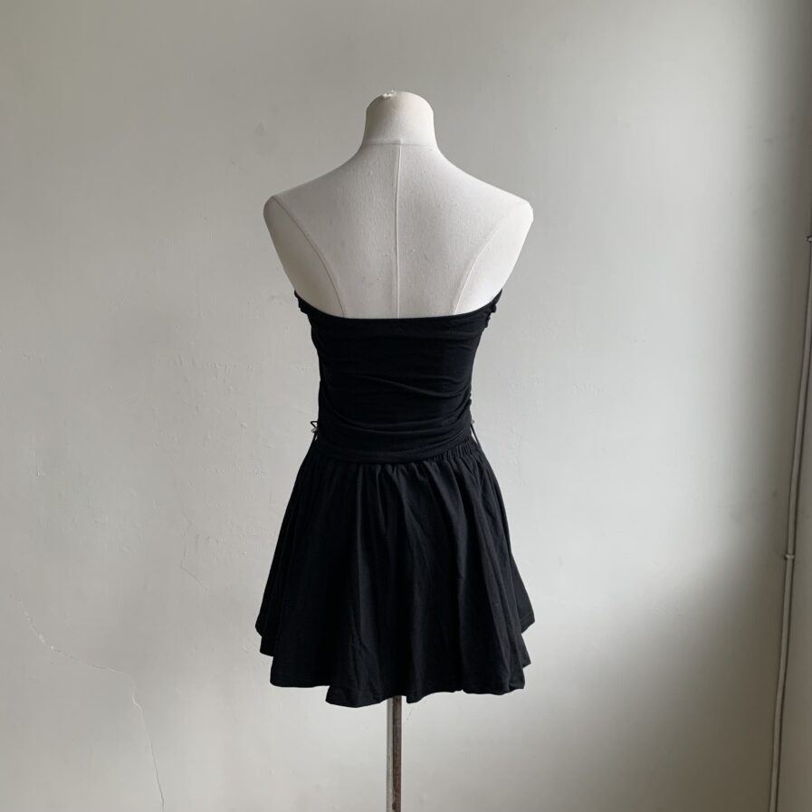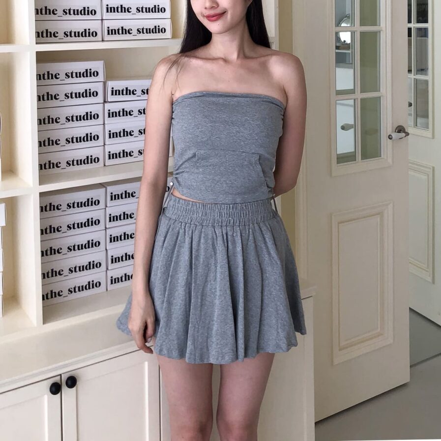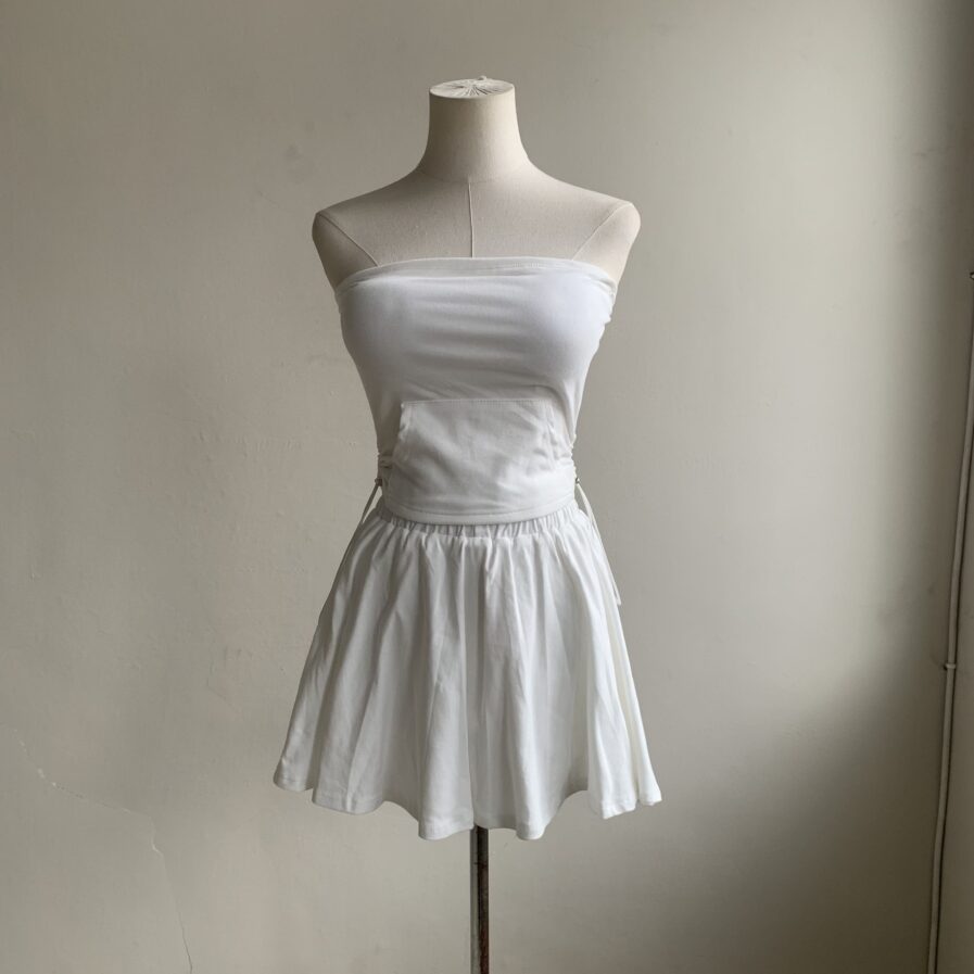 這套平口棉質套裝超可愛! 上衣是平口設計 還貼心做了胸墊 後鬆緊+下抽繩穿起來很穩~ 還有小口袋超加分✨ 下半身是傘狀裙子 俏皮可愛又有內裡褲子 完全不用怕走光 穿起來舒服又安心💕