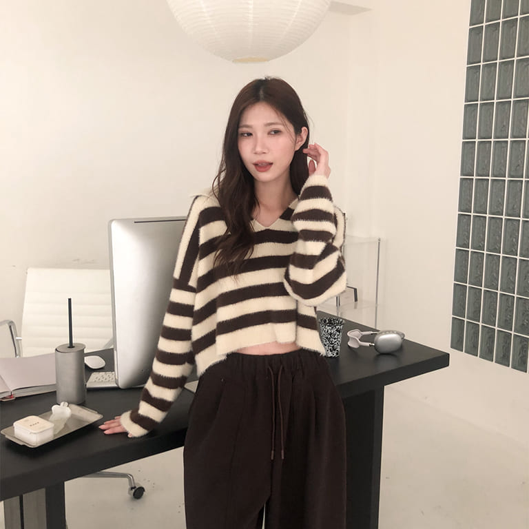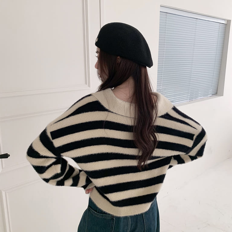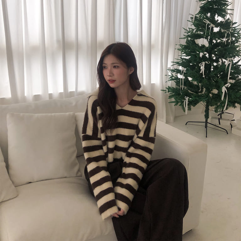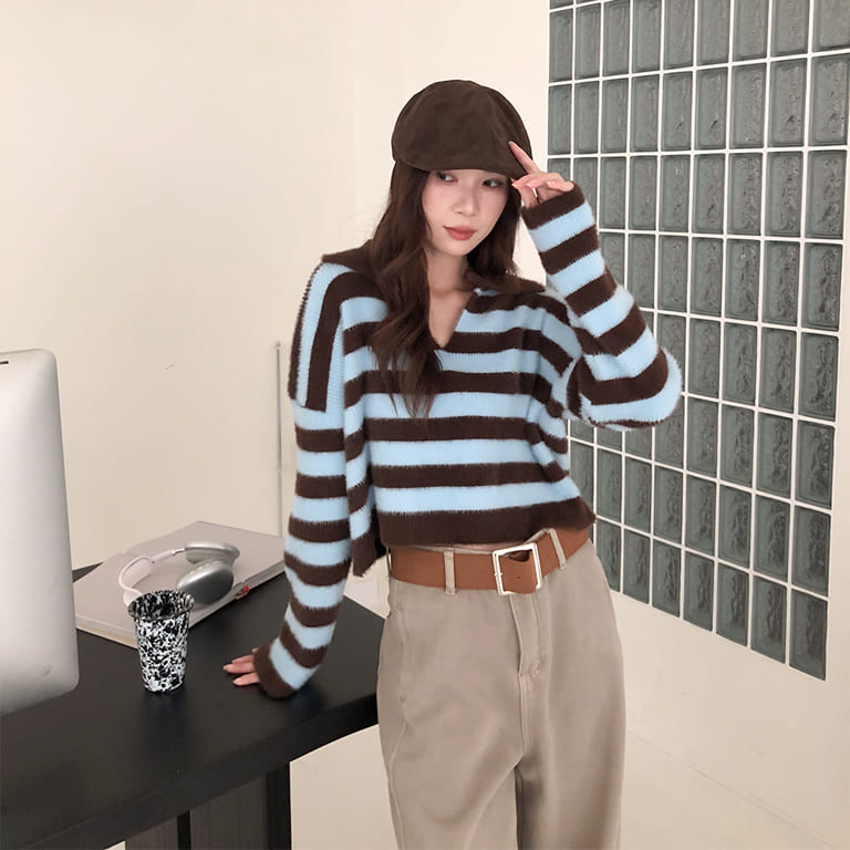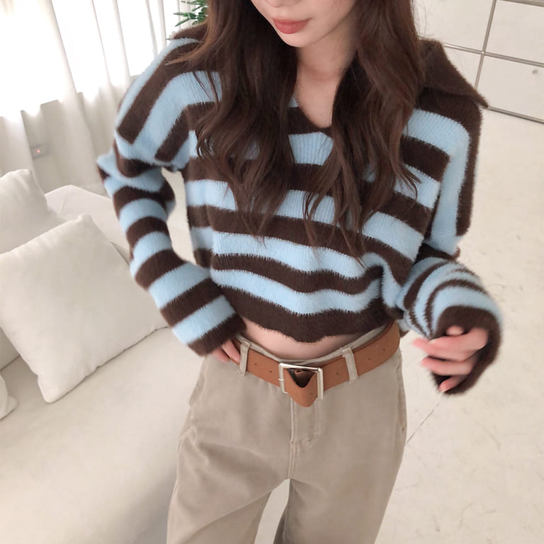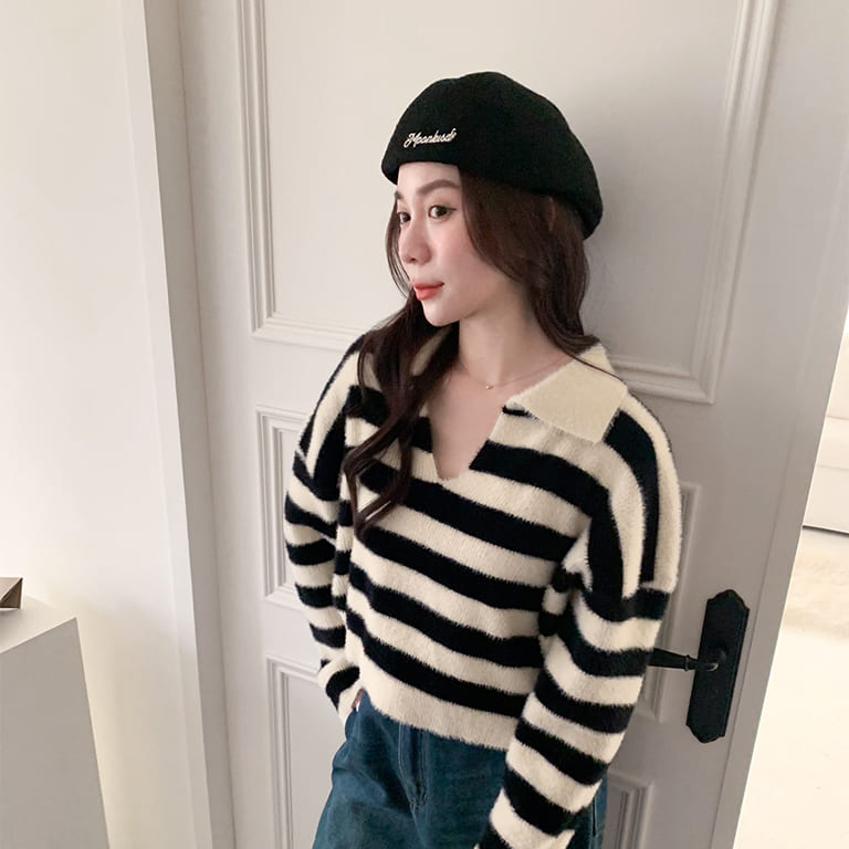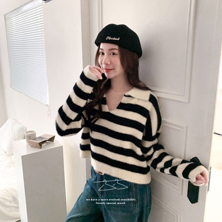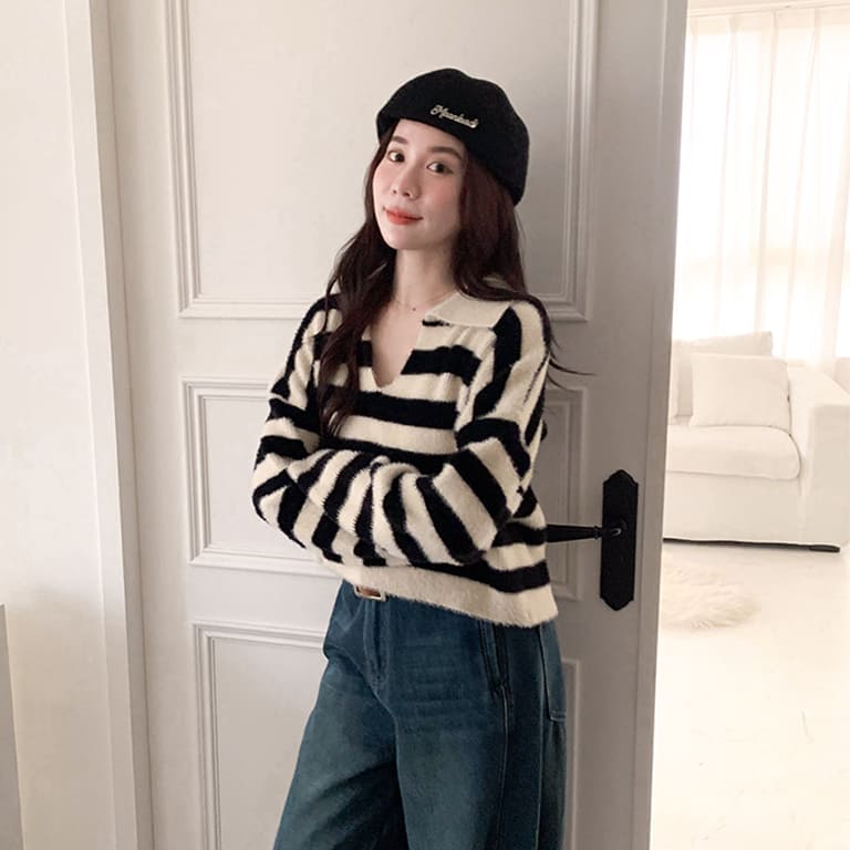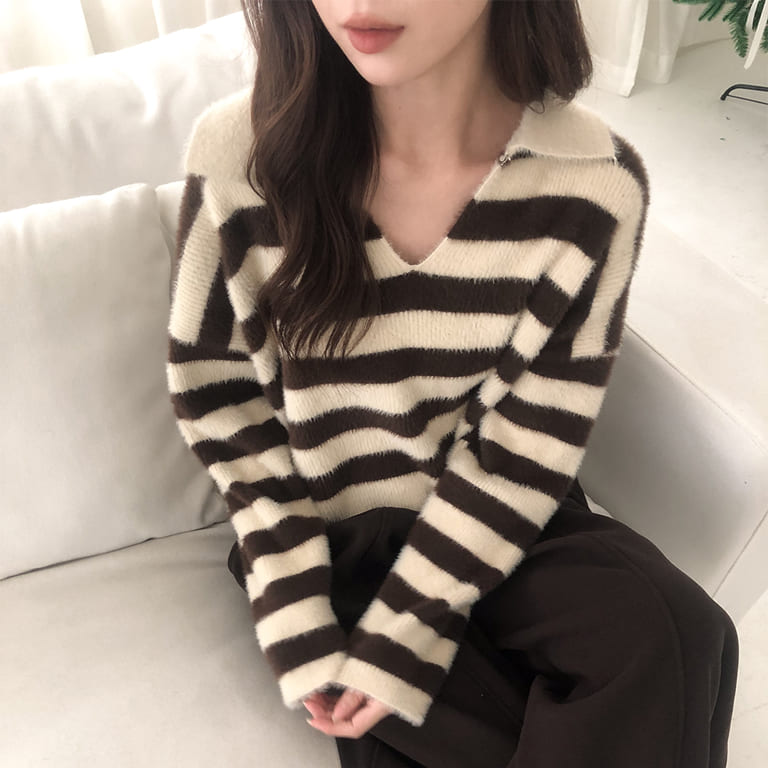 韓妞都在穿的那種條紋款🇰🇷水貂毛材質親膚又有暖度。POLO領設計讓整體更有層次感。簡單搭一件下身,就很有穿搭完成度。