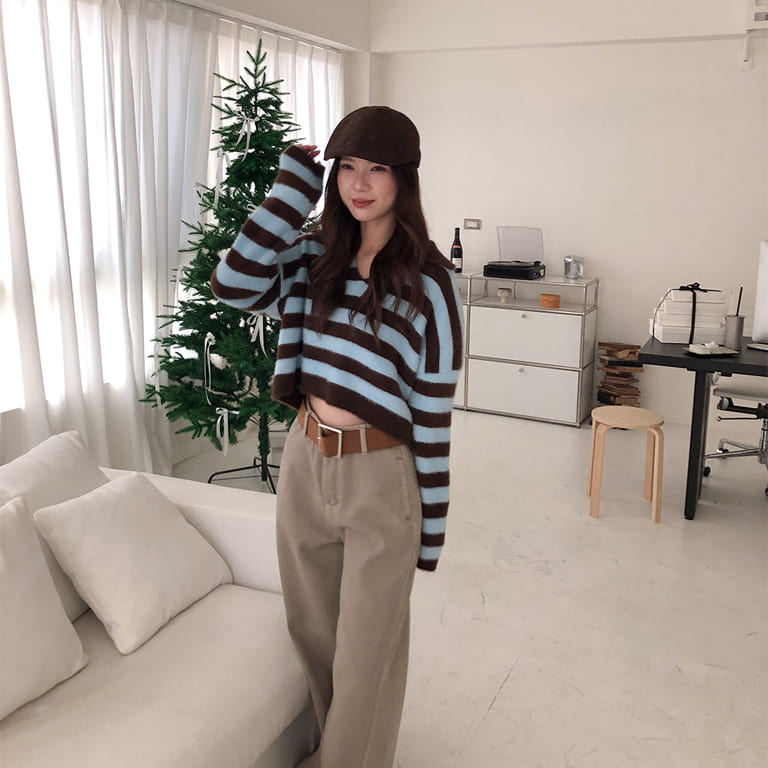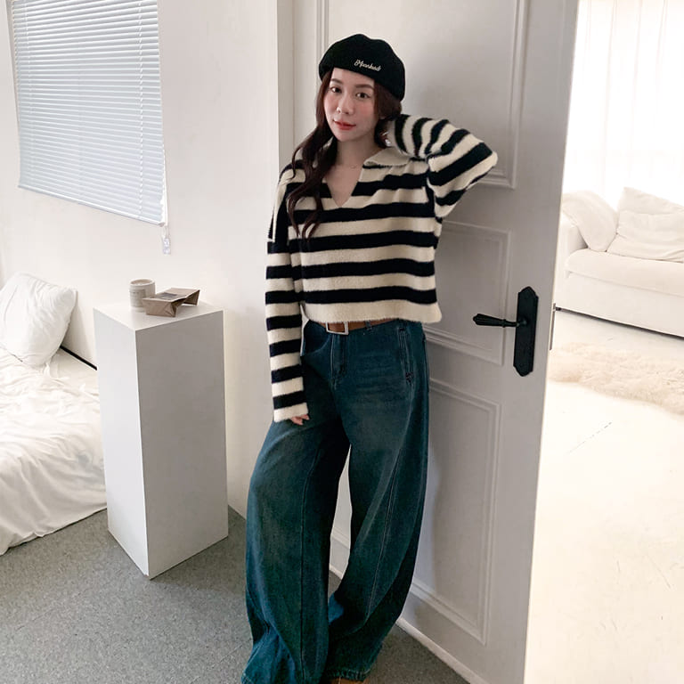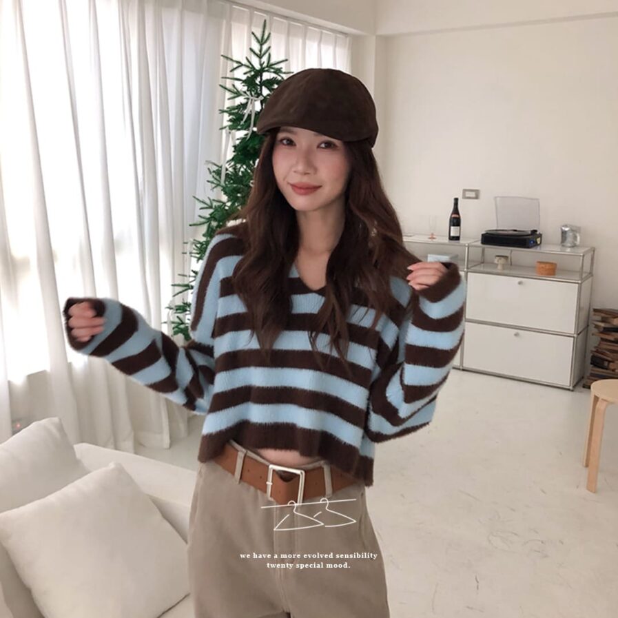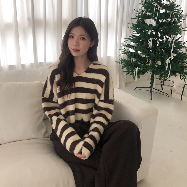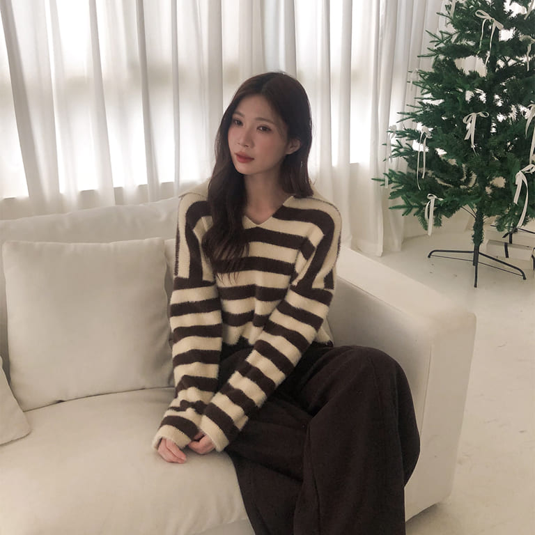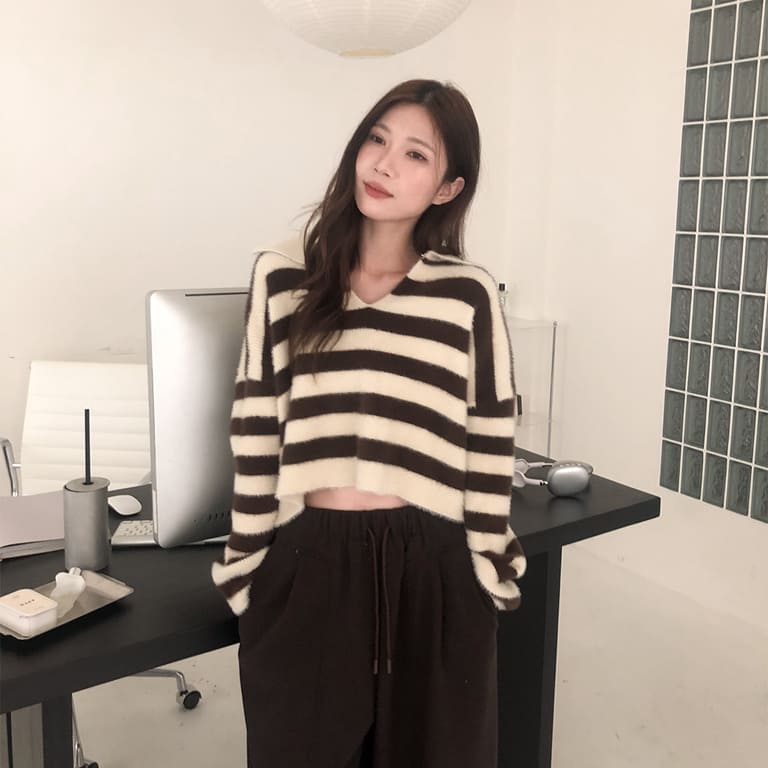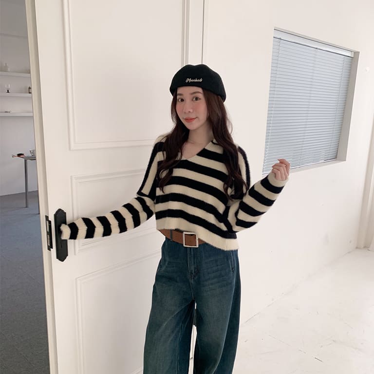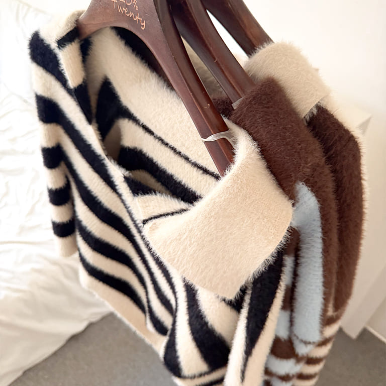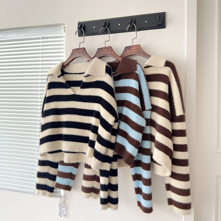 韓妞都在穿的那種條紋款🇰🇷水貂毛材質親膚又有暖度。POLO領設計讓整體更有層次感。簡單搭一件下身,就很有穿搭完成度。